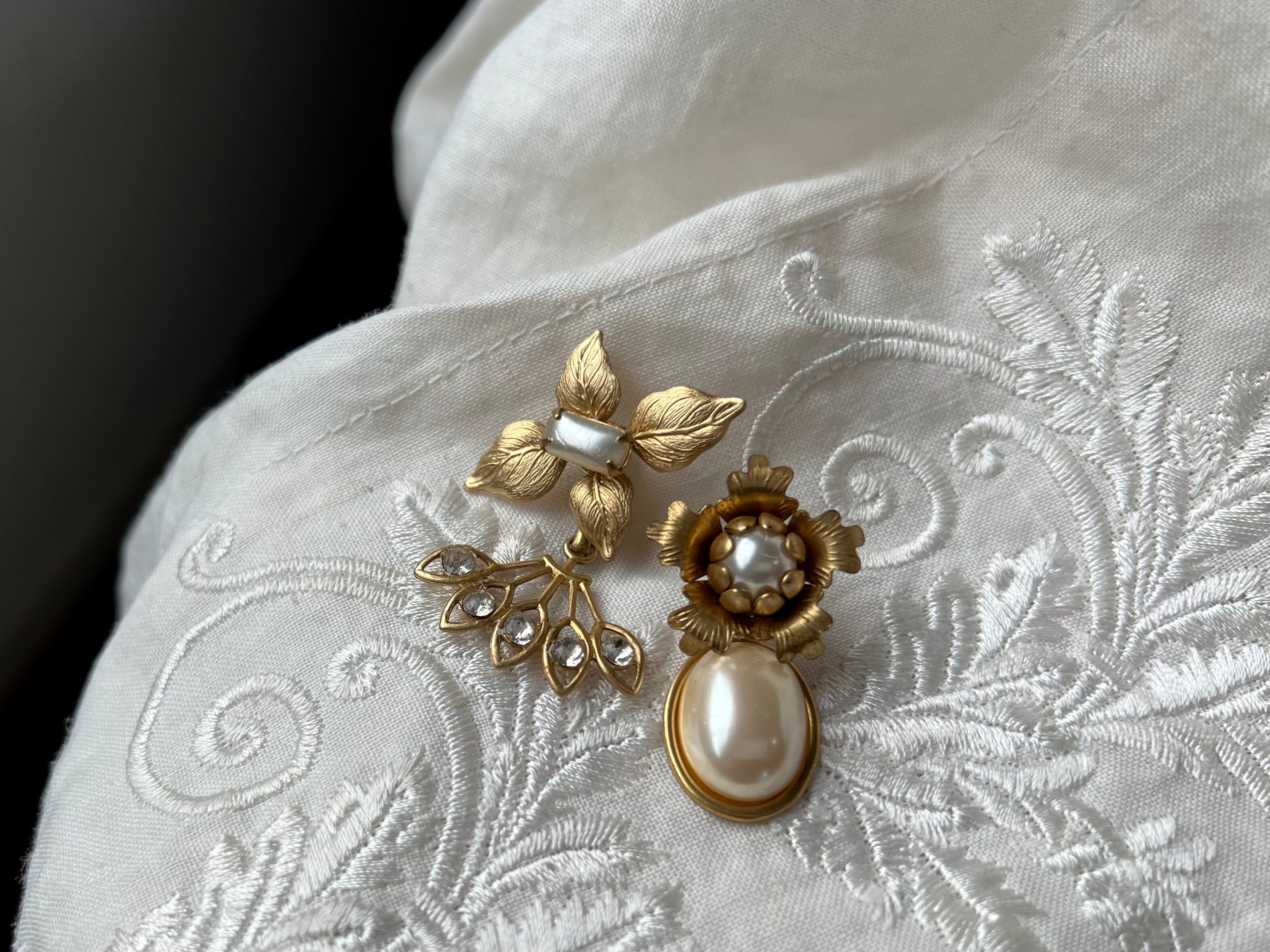 ヴィンテージパーツを使用してアシンメトリーなピアスを作りました。