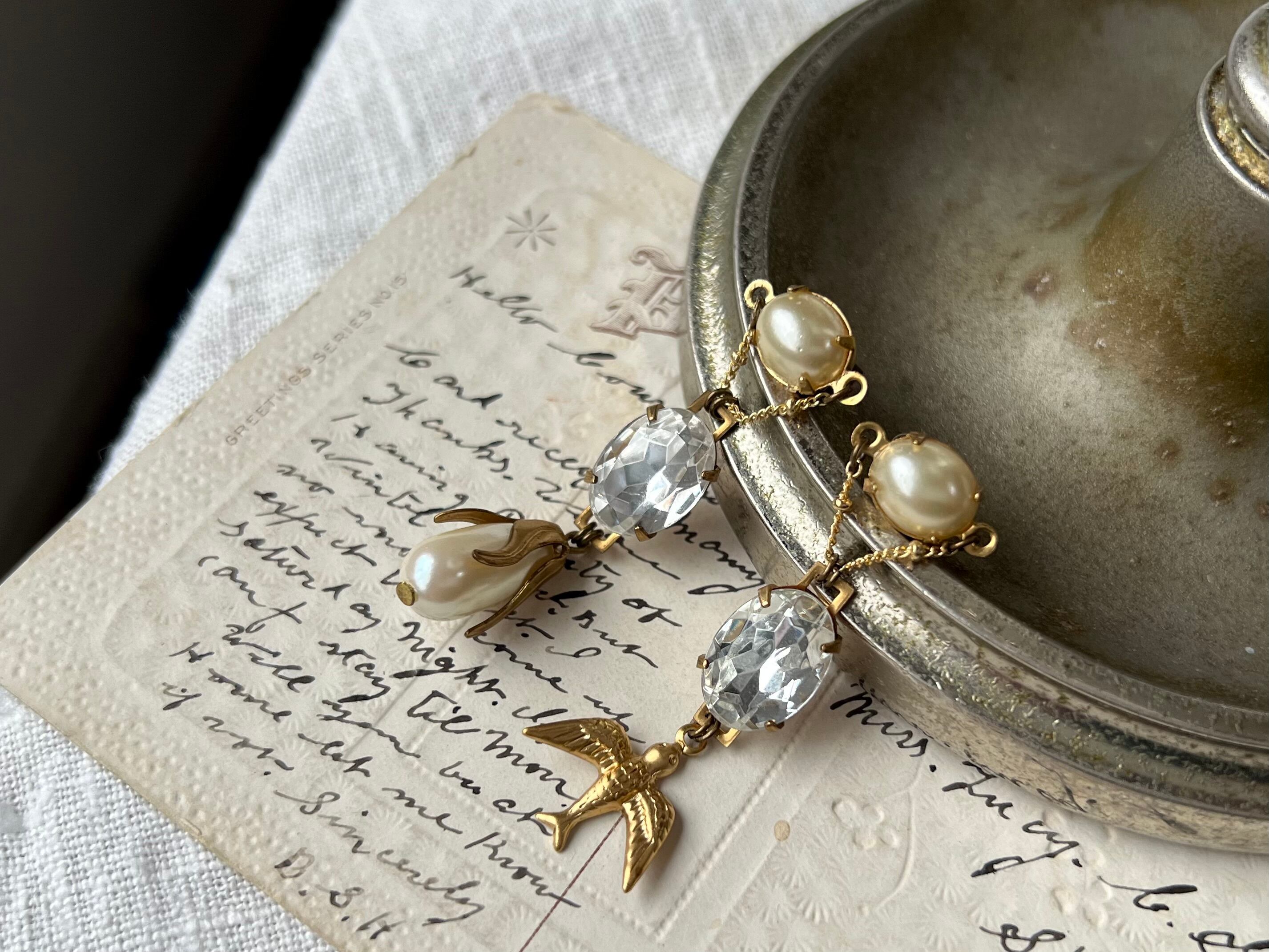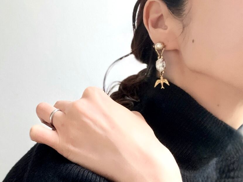 小ぶりなパールをカボションに、クリアガラスとパールやバードチャームを合わせています。