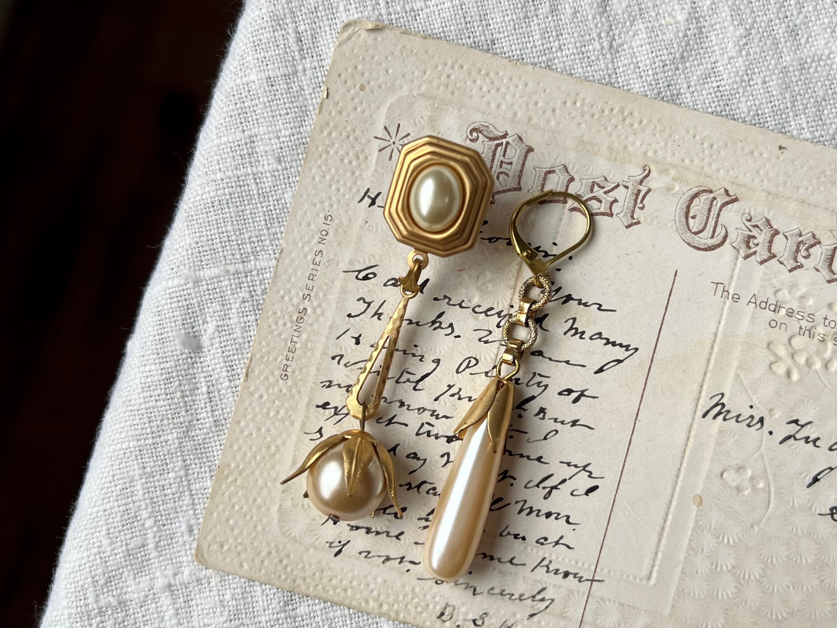 ヴィンテージパーツを使用してアシンメトリーなピアスを作りました。