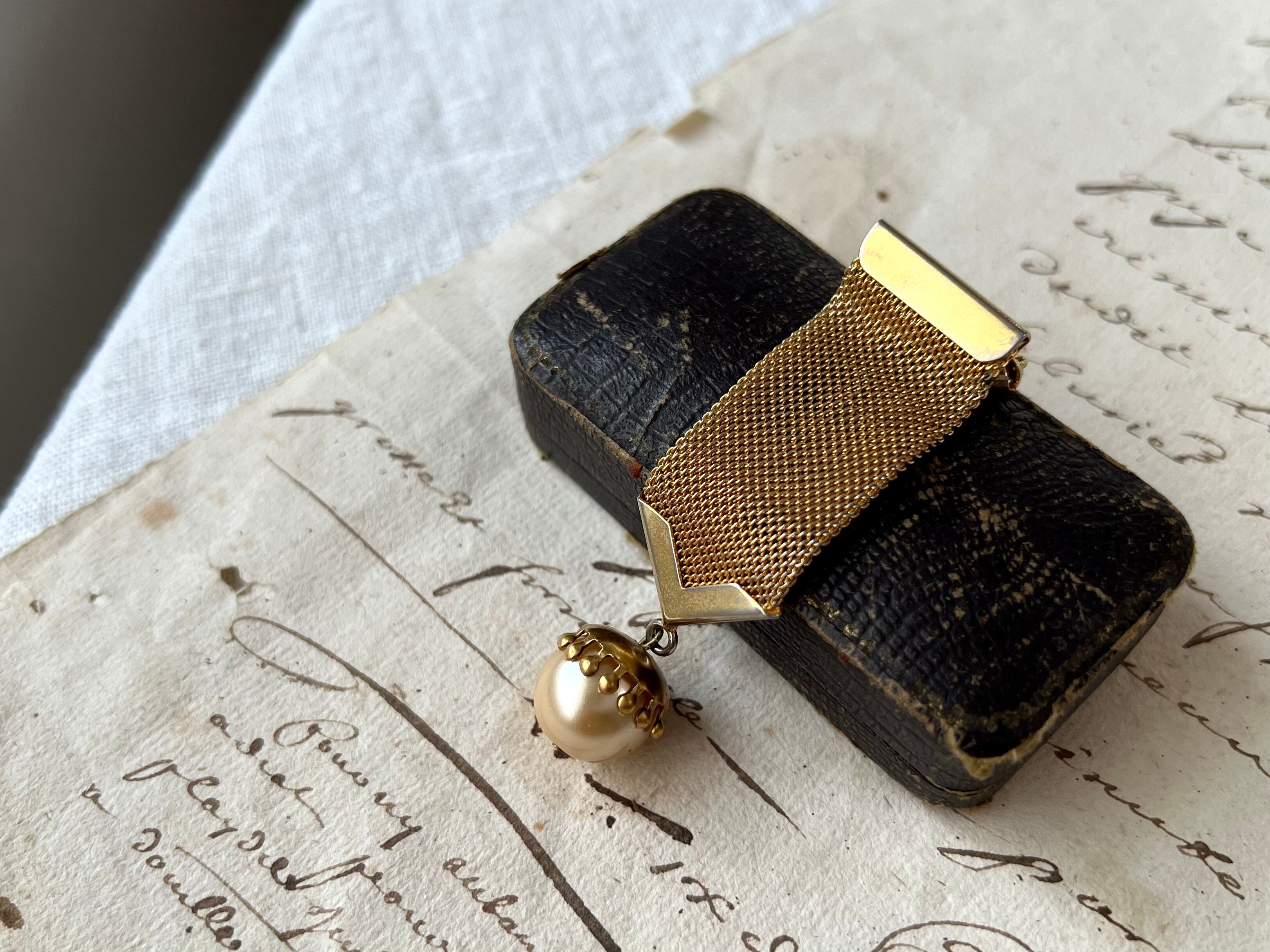 リボンチェーンにガラスパールを添えたシンプルなデザインですが、装いにひとつプラスするだけでクラシカルな雰囲気がグッと高まります。