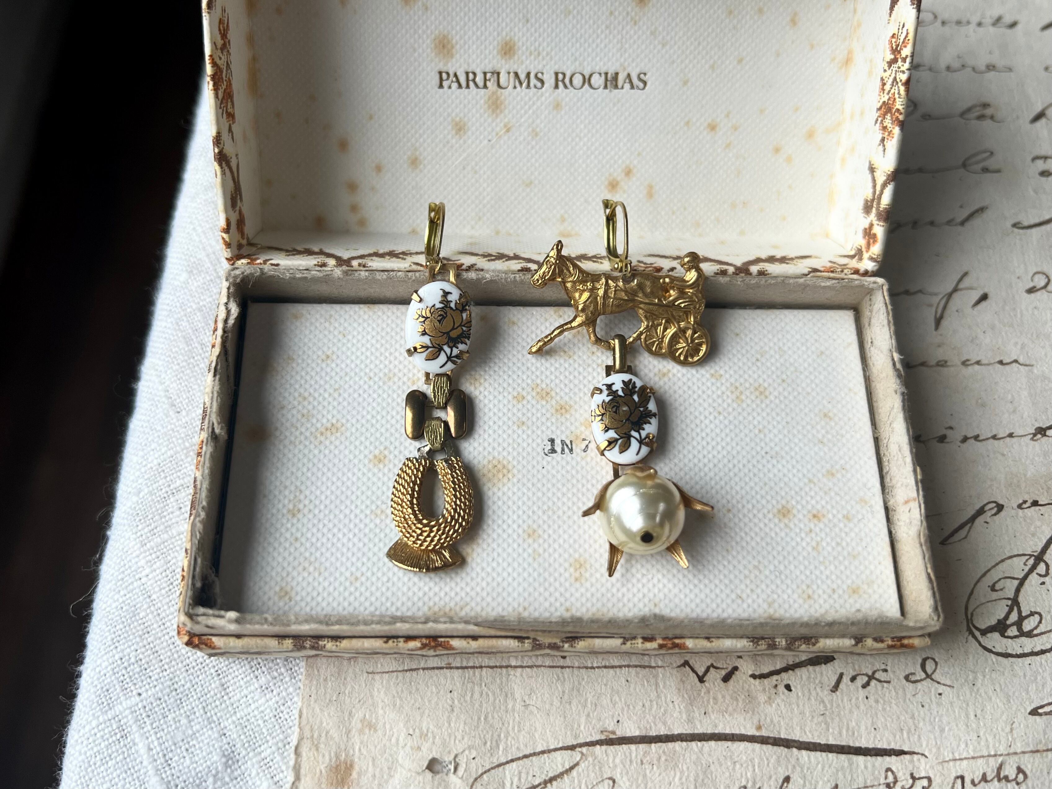 ヴィンテージパーツを使用してアシンメトリーなピアスを作りました。