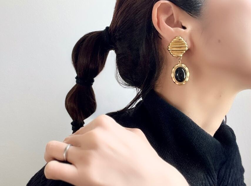 個性的なチェーンとブラックのカボションを組み合わせてアシンメトリーに仕上げています。