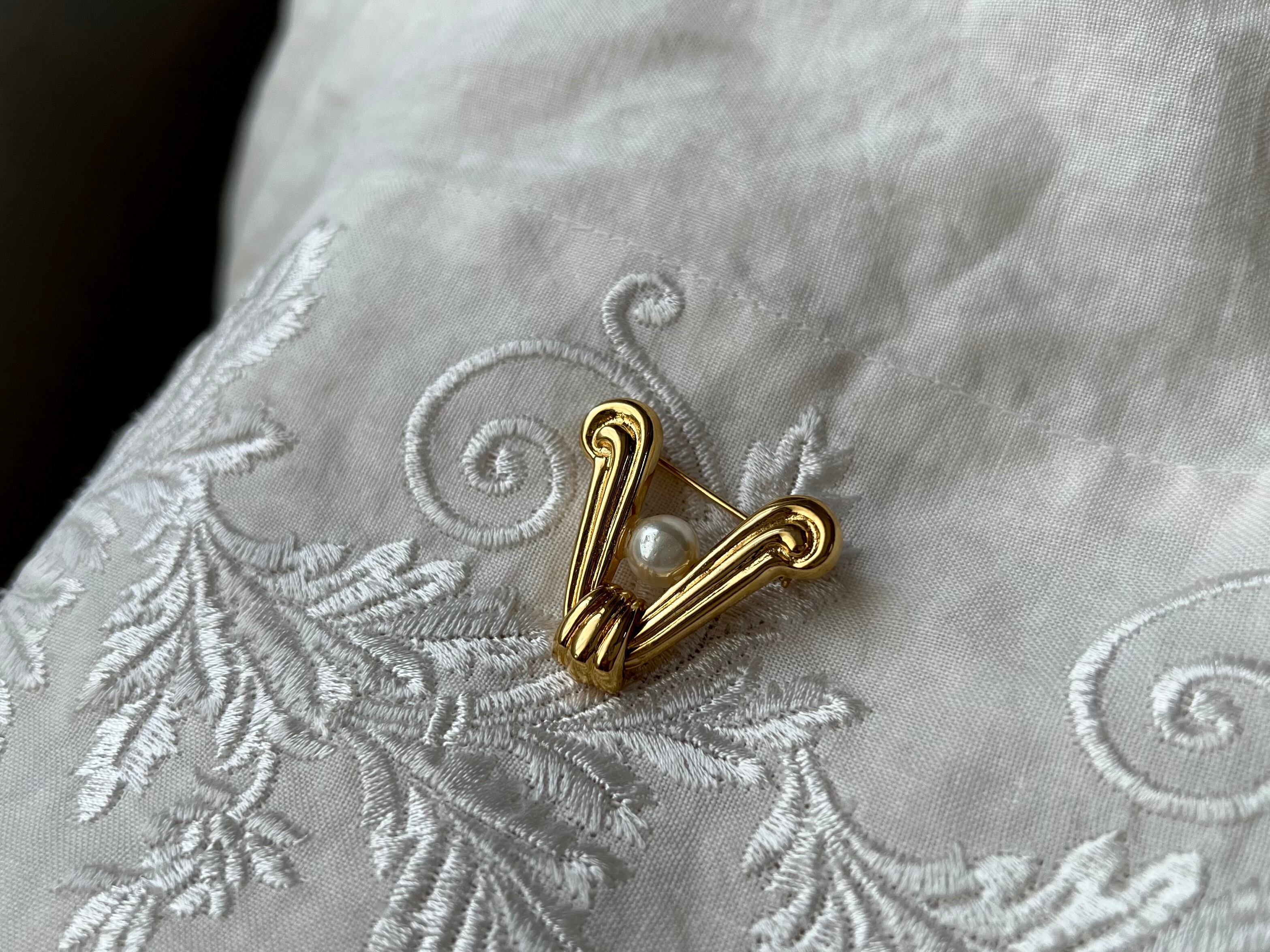V字のブローチをベースにパールを添えて華やかさをプラスしています。