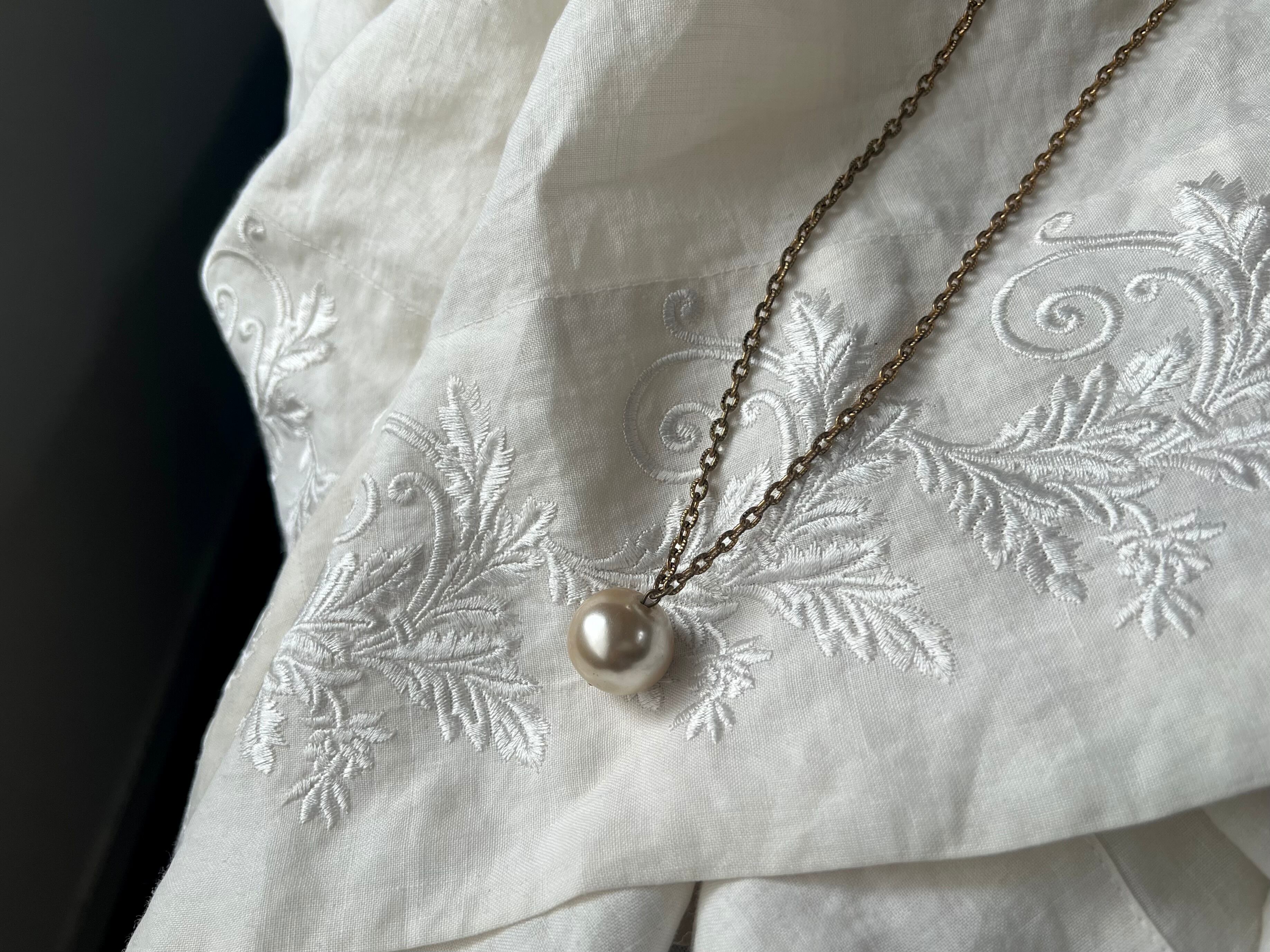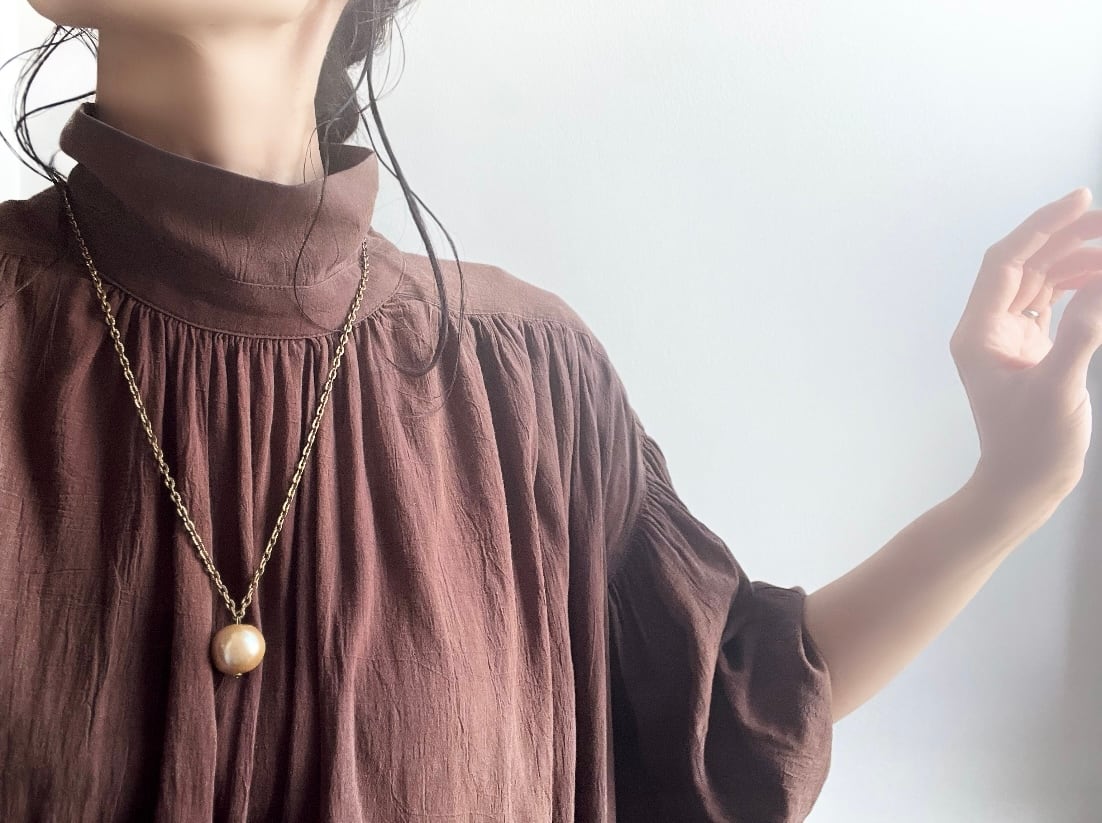 チェーンにガラスパールを一粒添えたシンプルなデザインですが、チェーンの風合いやパールのボリュームに存在感があり、装いの良いアクセントになります。