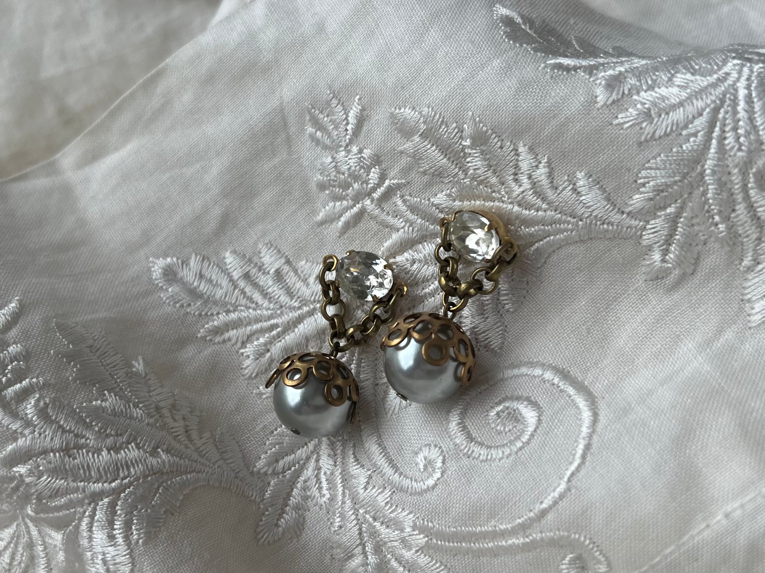 クリアカットガラスをカボションに、シルバーグレーのパールをチェーンで繋いでいます。