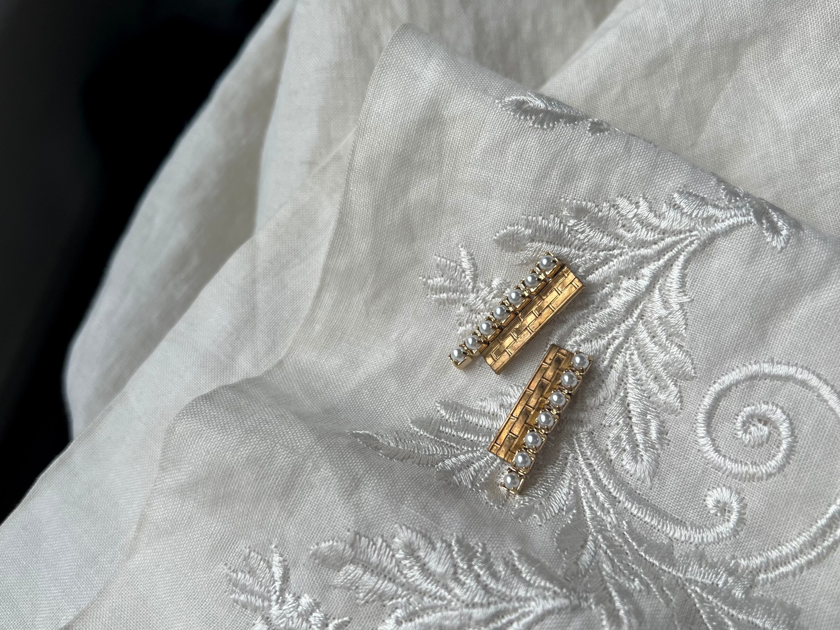 ブラスプレートにパールチェーンを添えたシンプルな仕上がりですが、ほんの少しパールがはみ出している所に個性が感じられます。