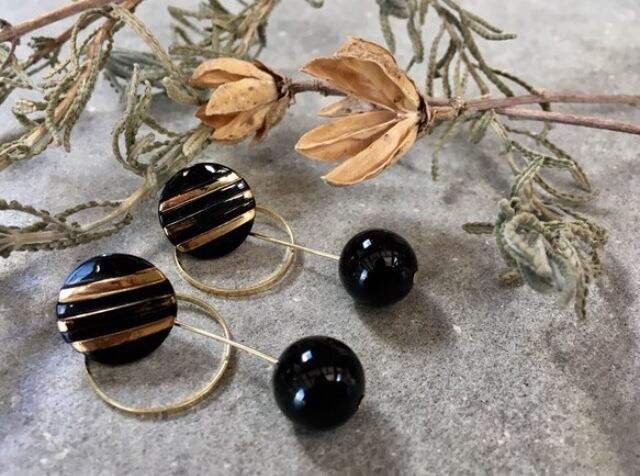 フランスのヴィンテージボタンをカボションに、メタルパーツやオニキスを添えてヴィンテージピアスを作りました。
