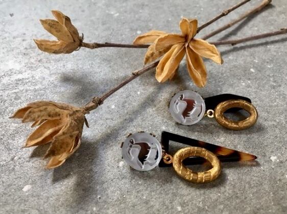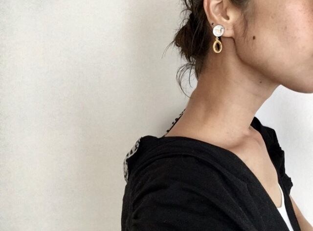ヴィンテージパーツやべっ甲、オニキス等で、アシンメトリーなハンドメイドのヴィンテージビーズピアスに仕上げました。