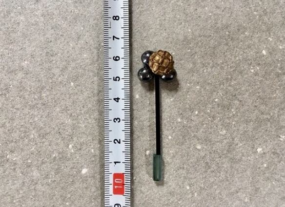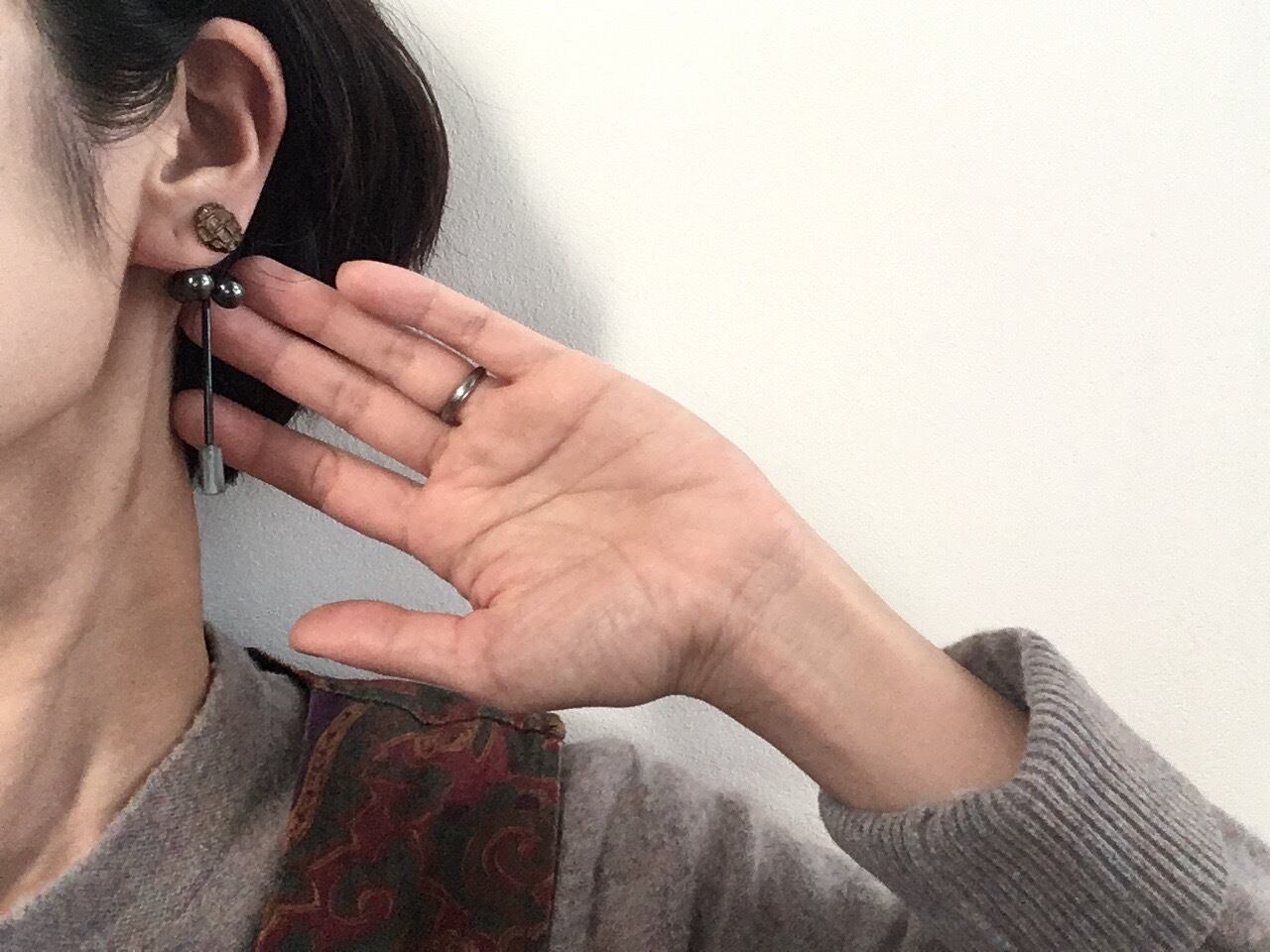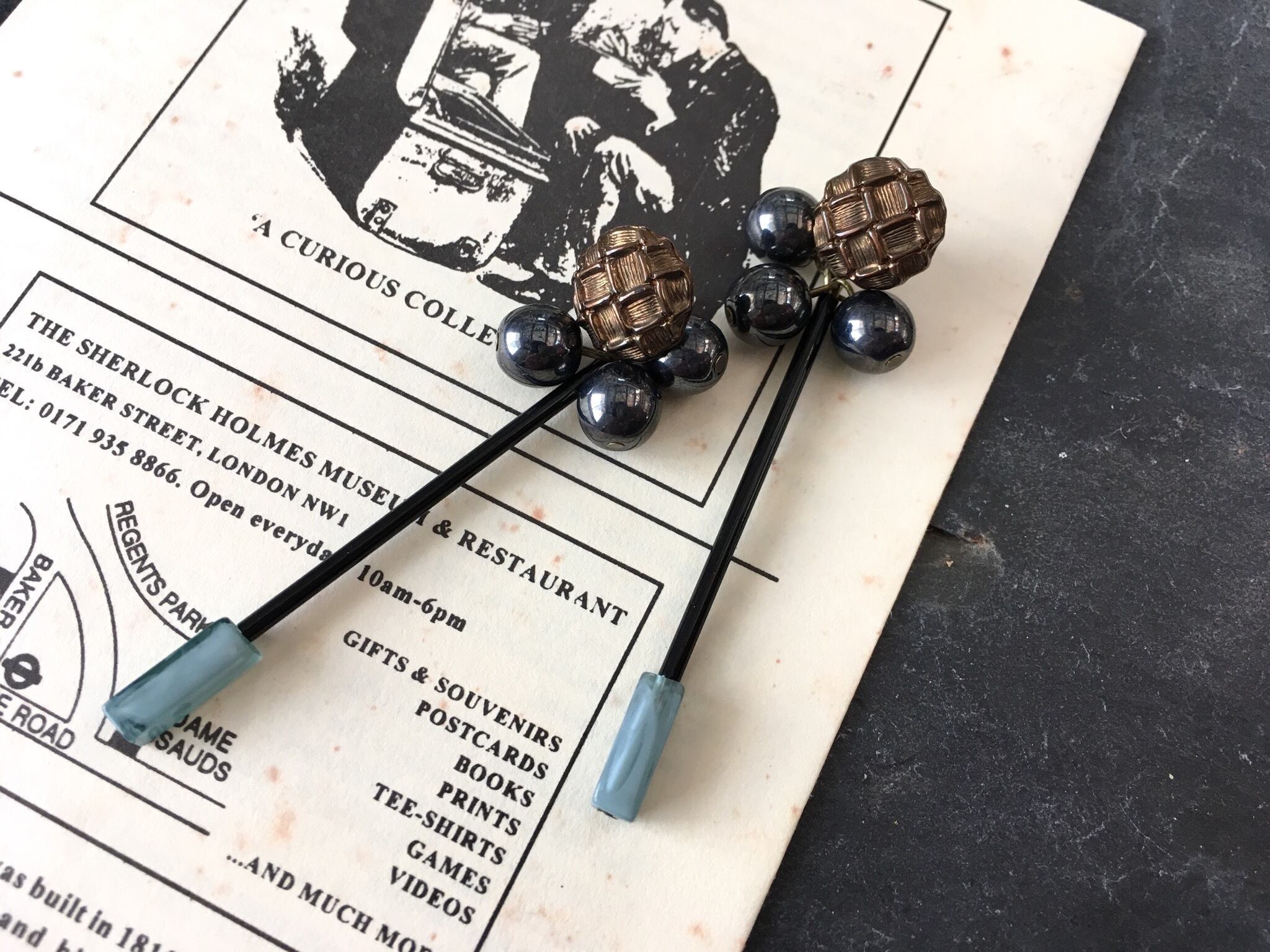 フランスから届いたヴィンテージボタンにチェコガラスを添え、更にアクセントにパイプを繋げました。