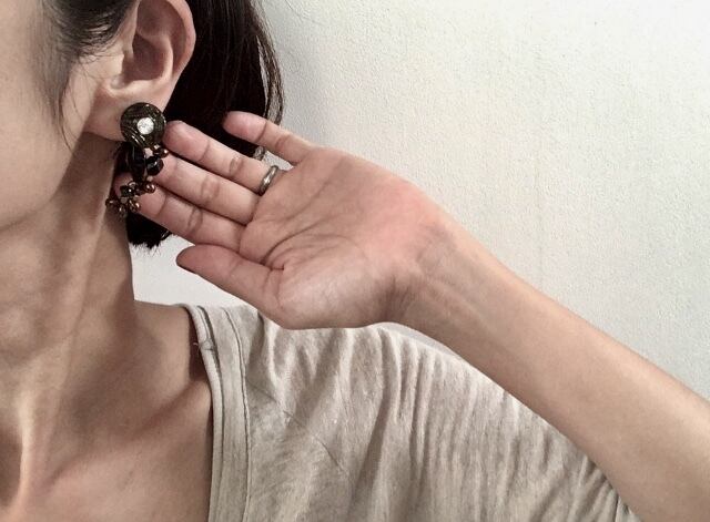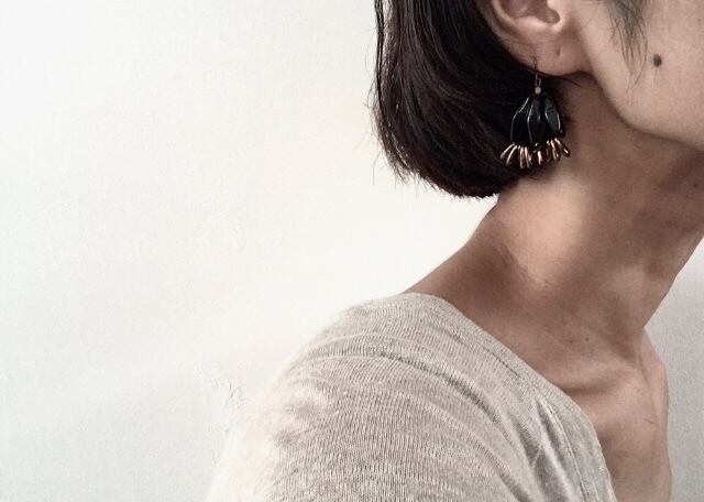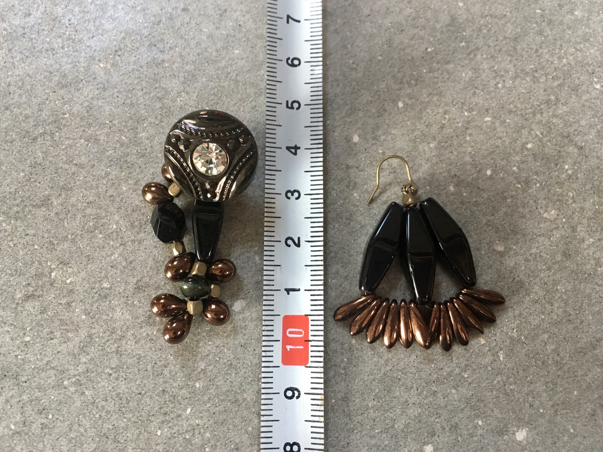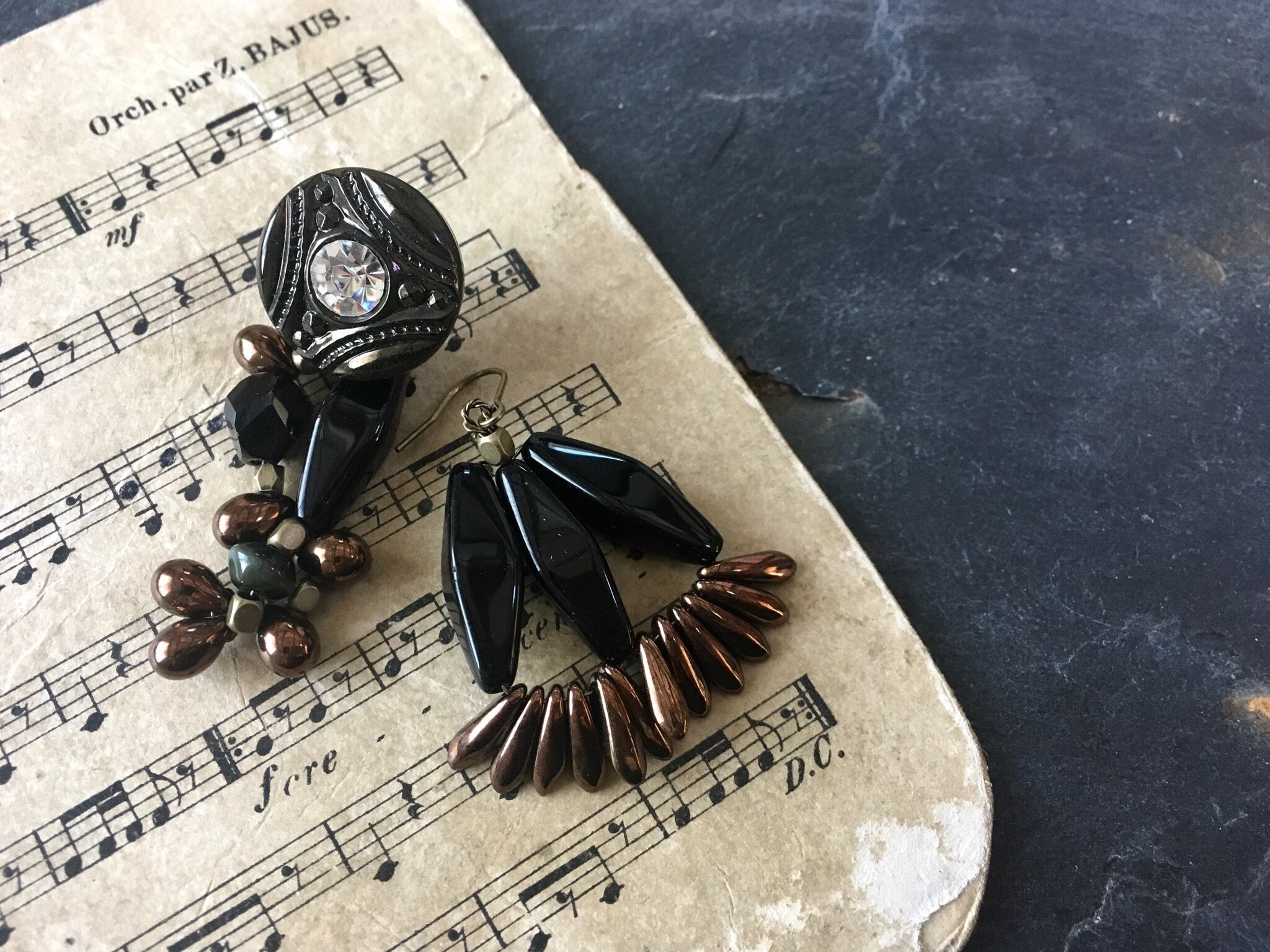 ヴィンテージチェコガラスボタンに、オニキスやガラスビーズを組み合わせて、アシンメトリーなヴィンテージピアスに仕上げました。