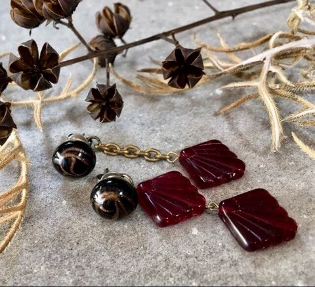 フランスのヴィンテージガラスボタンをカボションに、チェコのヴィンテージガラスビーズをアシンメトリーに添えて、ヴィンテージピアスに仕上げました。