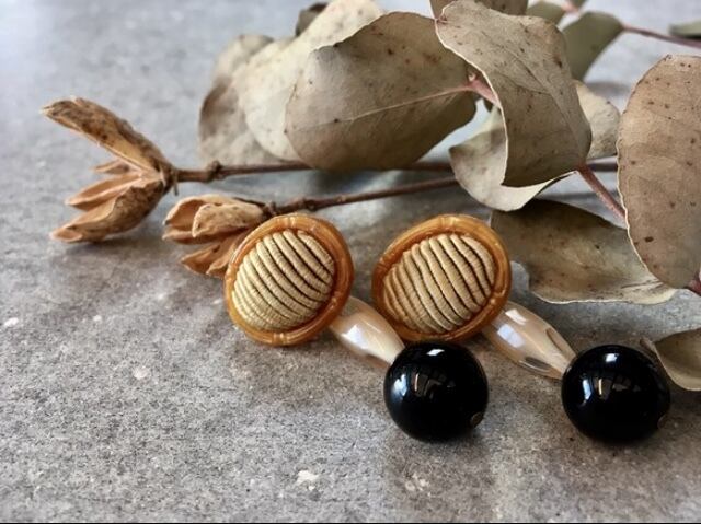 ヴィンテージボタンをカボションに、チェコガラスやオニキスを組み合わせて、ピアスを作りました。