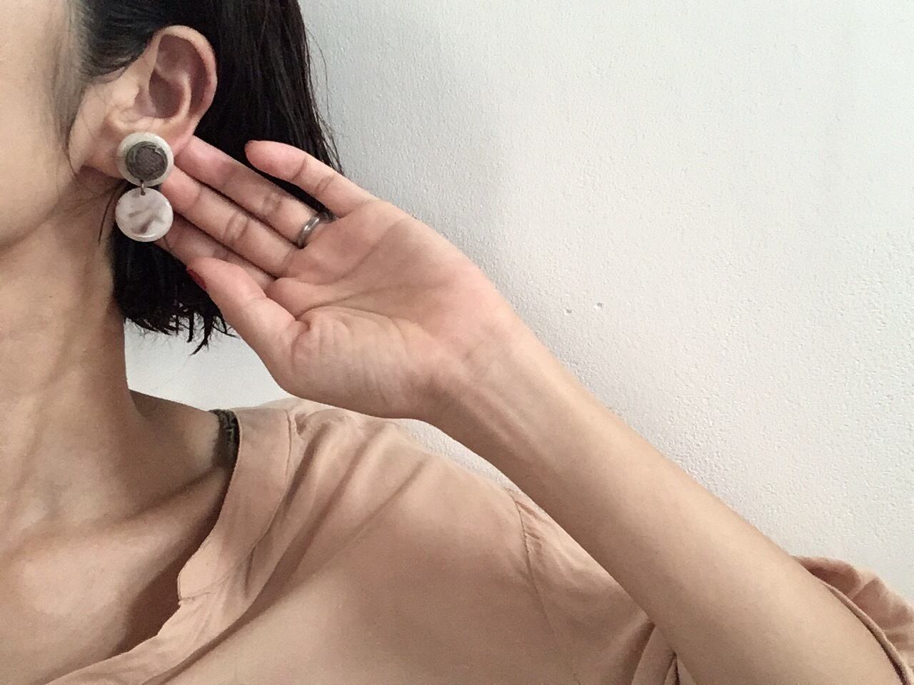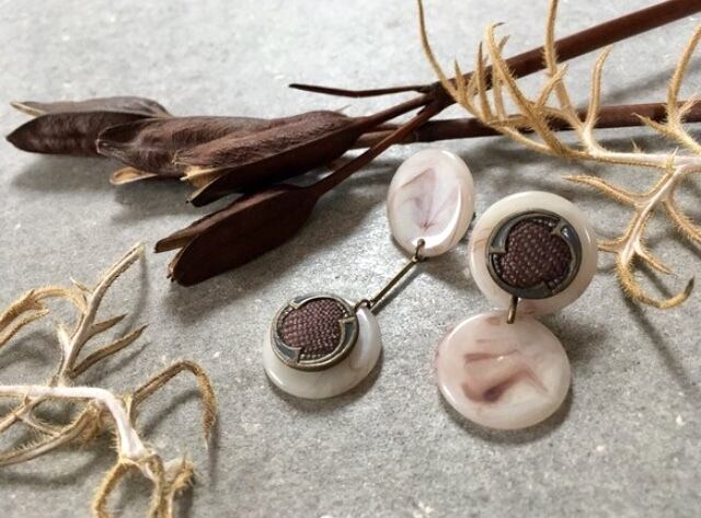 フランスから届いたヴィンテージボタンとヴィンテージパーツを組み合わせて、アシンメトリーなピアスを作りました。