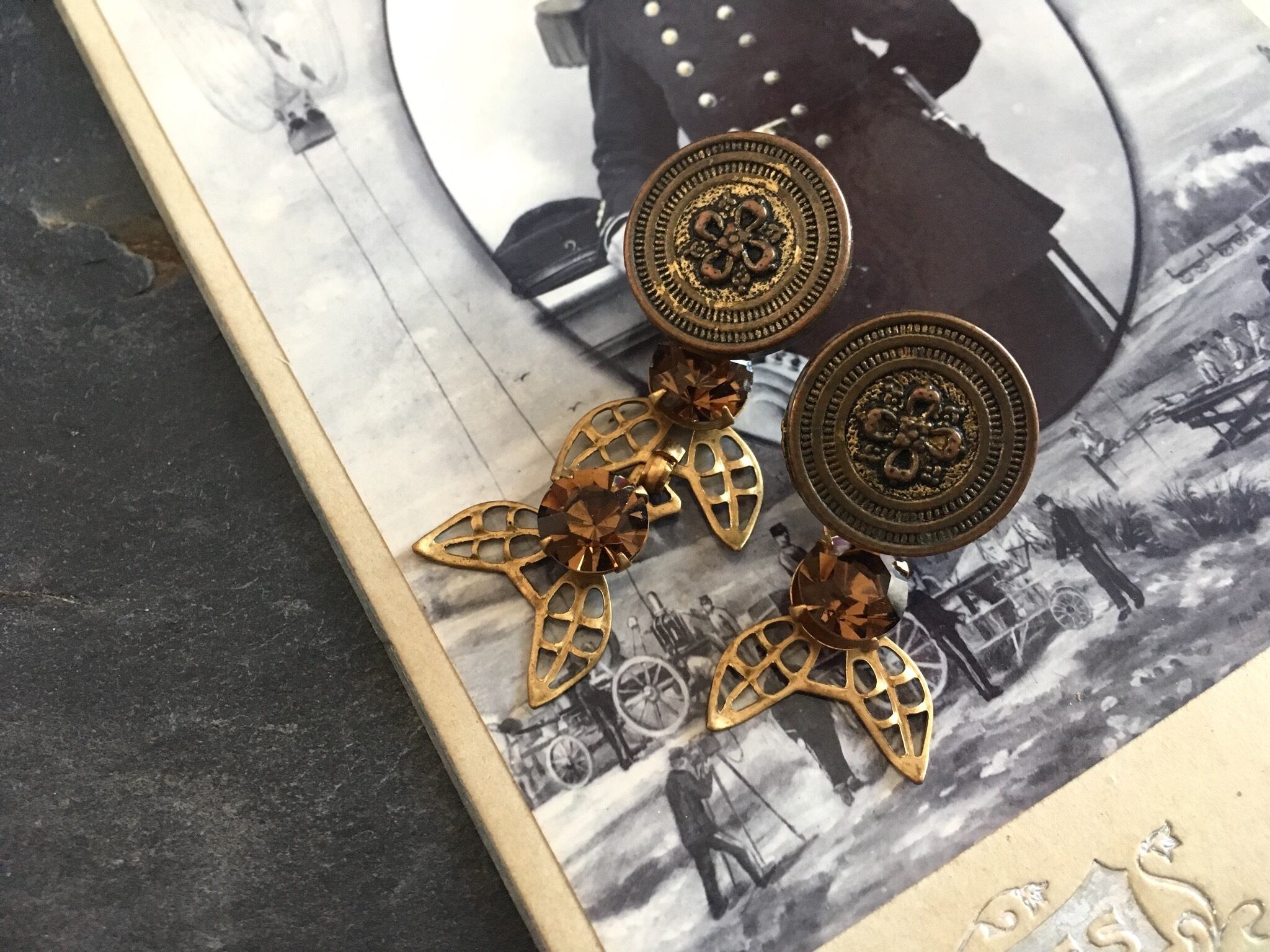 フランスから届いたヴィンテージボタンと、ヴィンテージパーツを組み合わせて、アシンメトリーなピアスを作りました。