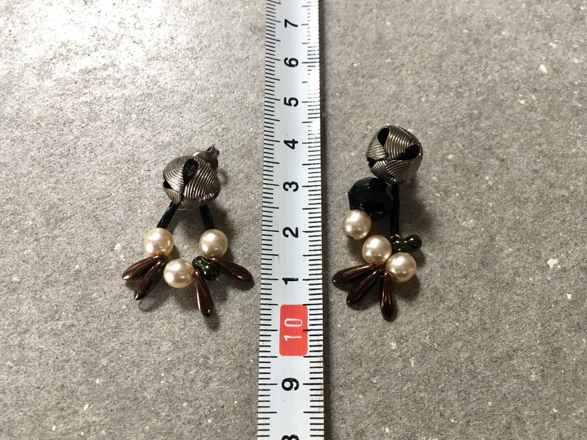 ヴィンテージボタンにヴィンテージビーズやチェコガラスを添えて、アシンメトリーなピアスを作りました。