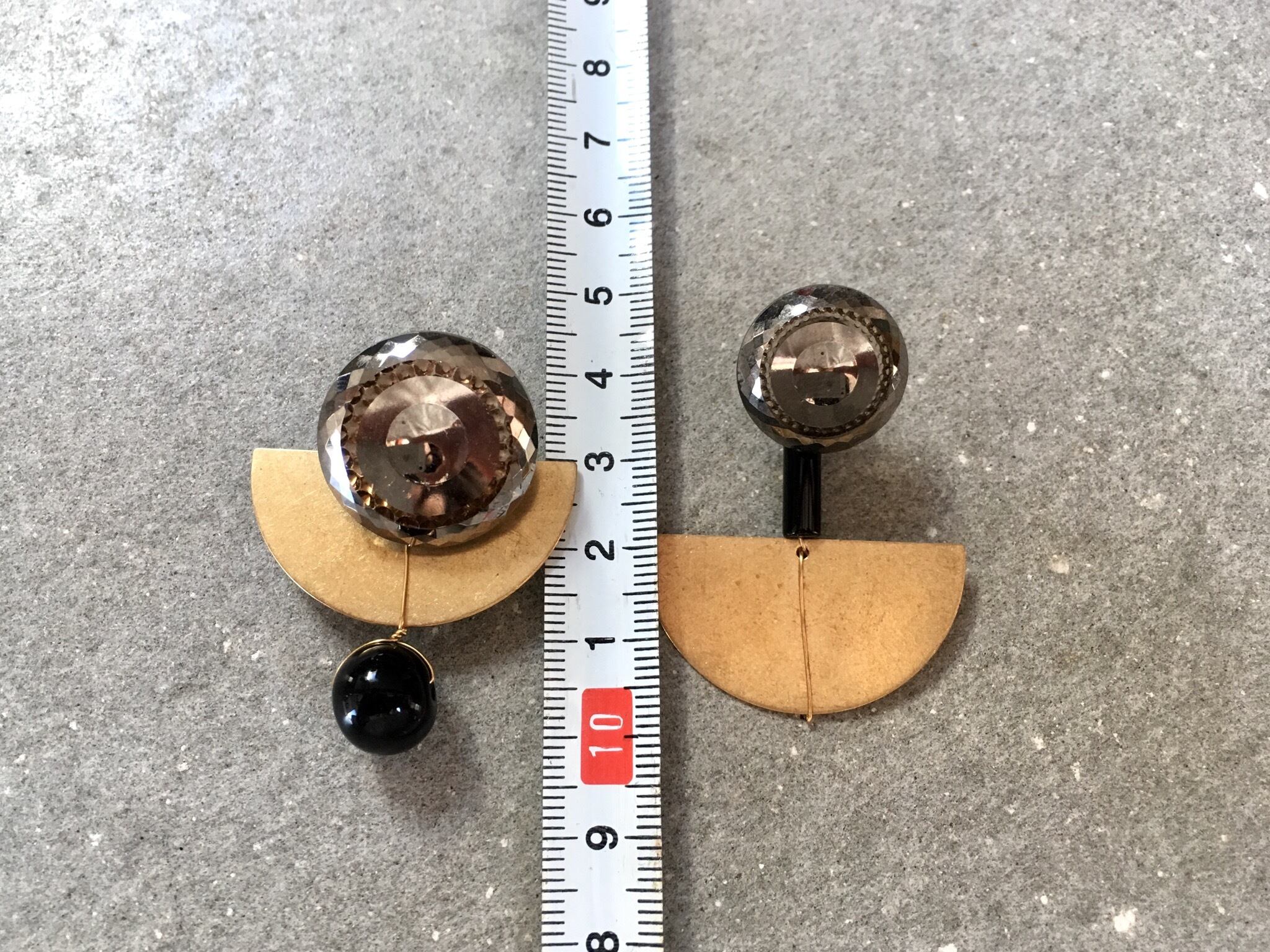 フランスのヴィンテージボタン、真鍮、オニキスを用いて、アシンメトリーなピアスに仕上げました。