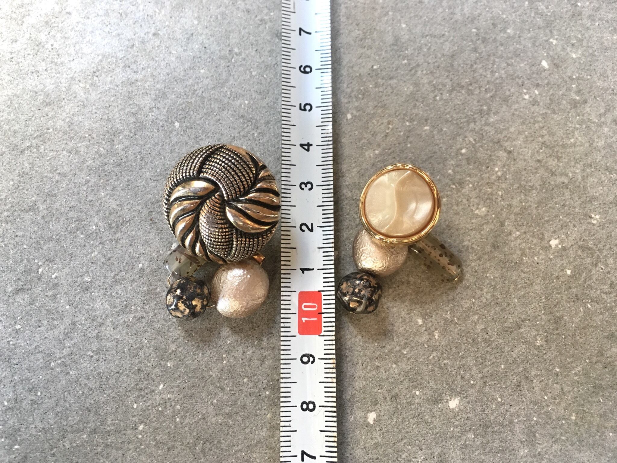 フランスのヴィンテージボタンをカボションに、様々なヴィンテージビーズを添えて、アシンメトリーなピアスにしあげました。