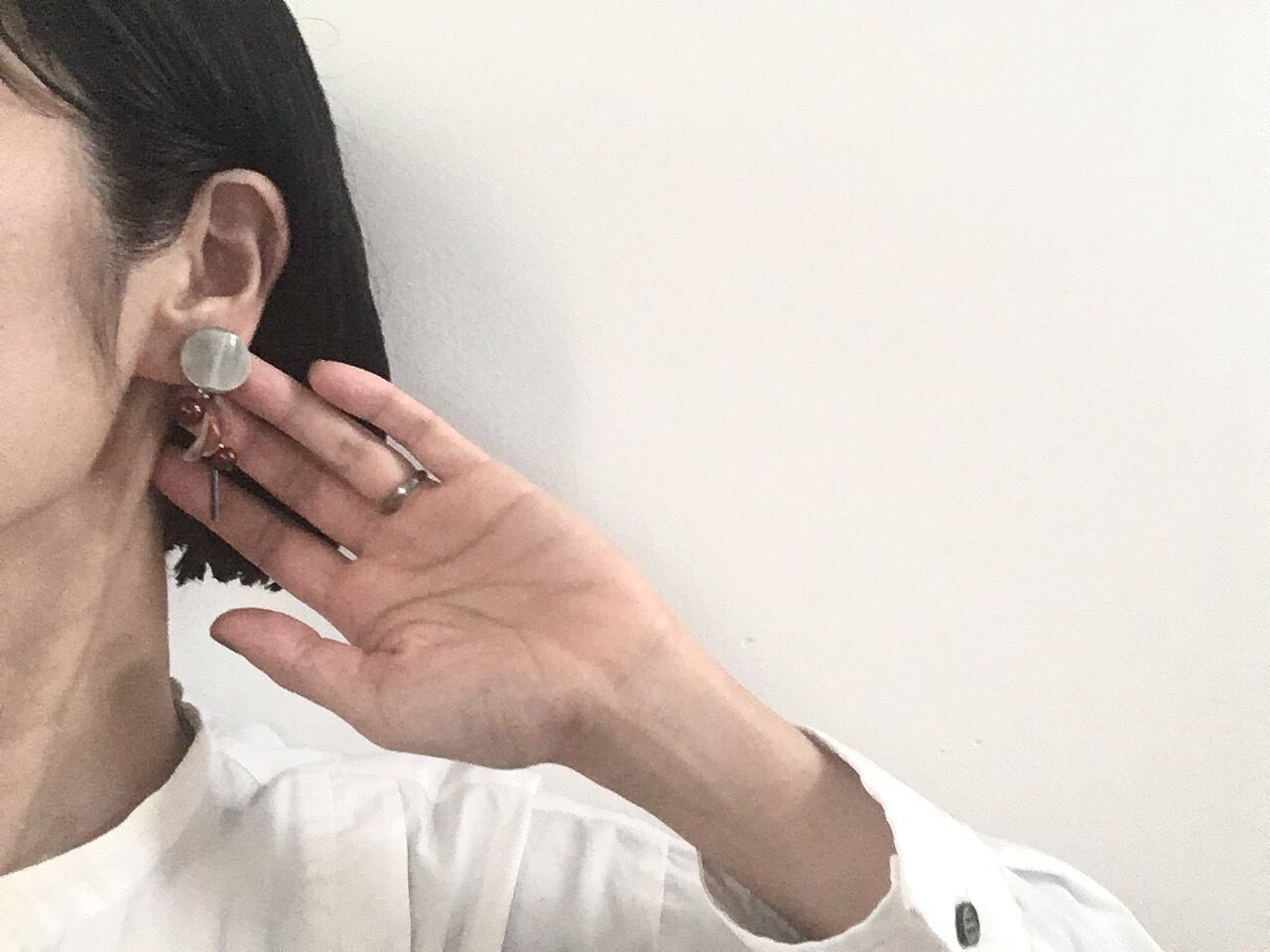 フランスのヴィンテージボタンをカボションに、ドイツのヴィンテージビーズ、パールビーズ、メタルパーツを添えてピアスを作りました。