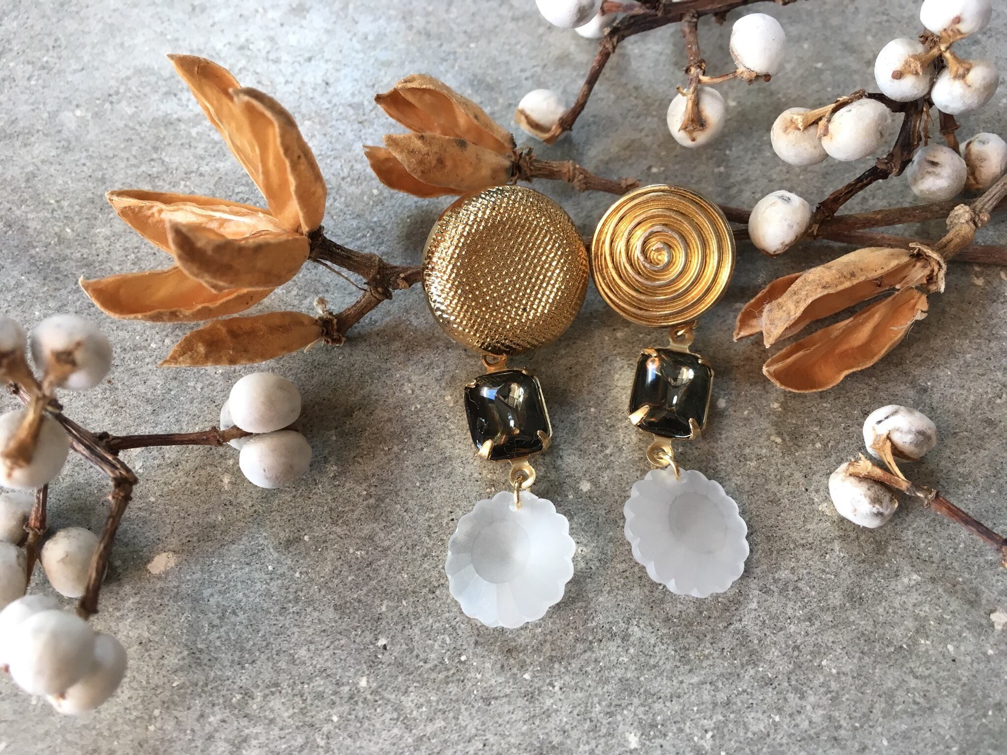 フランスのヴィンテージボタンやヴィンテージビーズを組み合わせて、アシンメトリーなピアスに仕上げました。