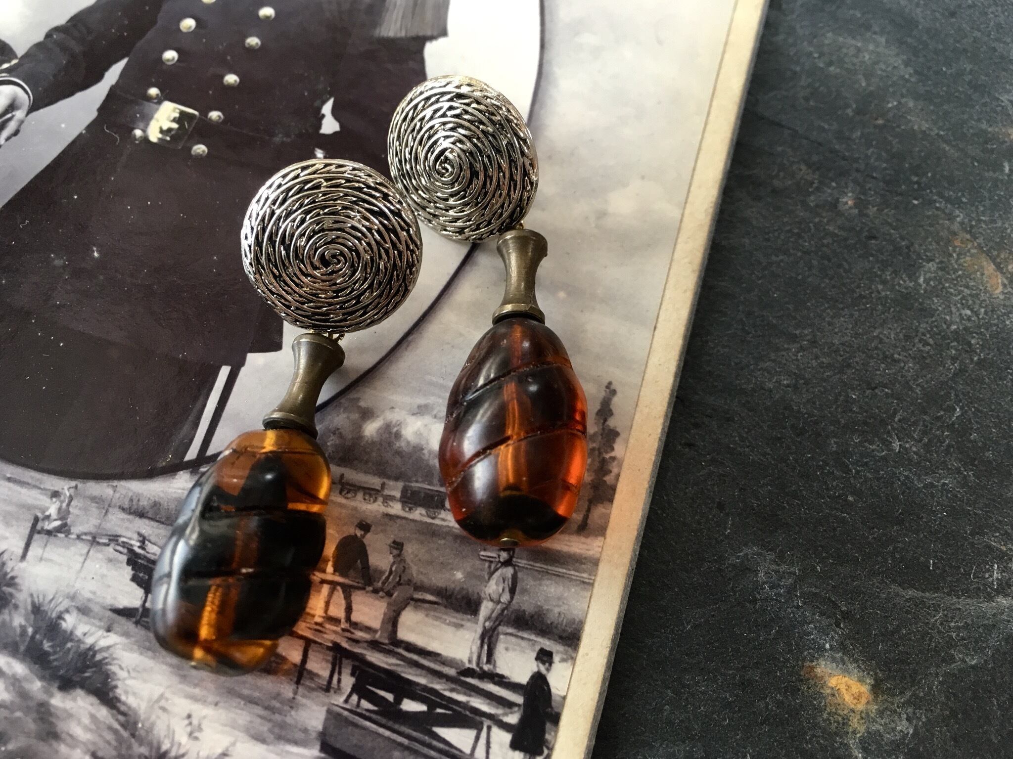 フランスのヴィンテージボタンとビーズを使って、ピアスに仕上げました。