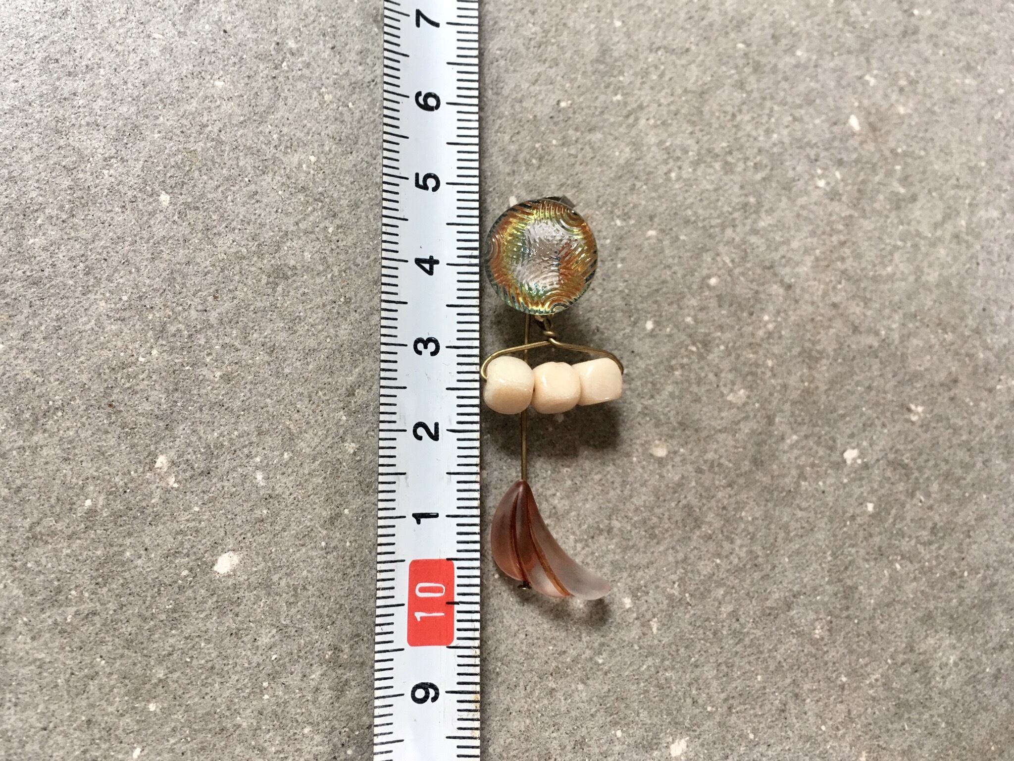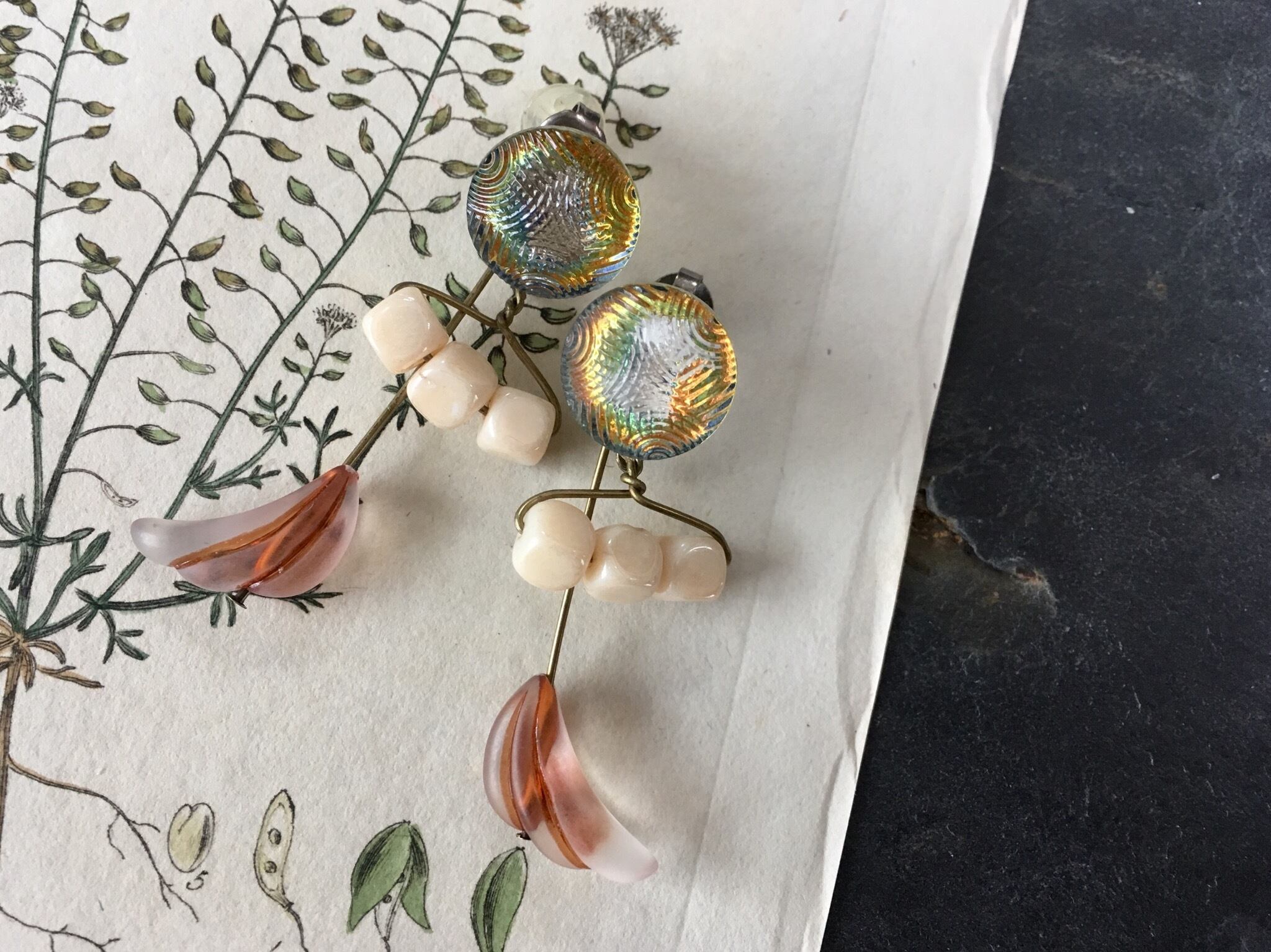 フランスのヴィンテージボタンをカボションに、チェコガラスやドイツのヴィンテージビーズを添えてピアスを作りました。