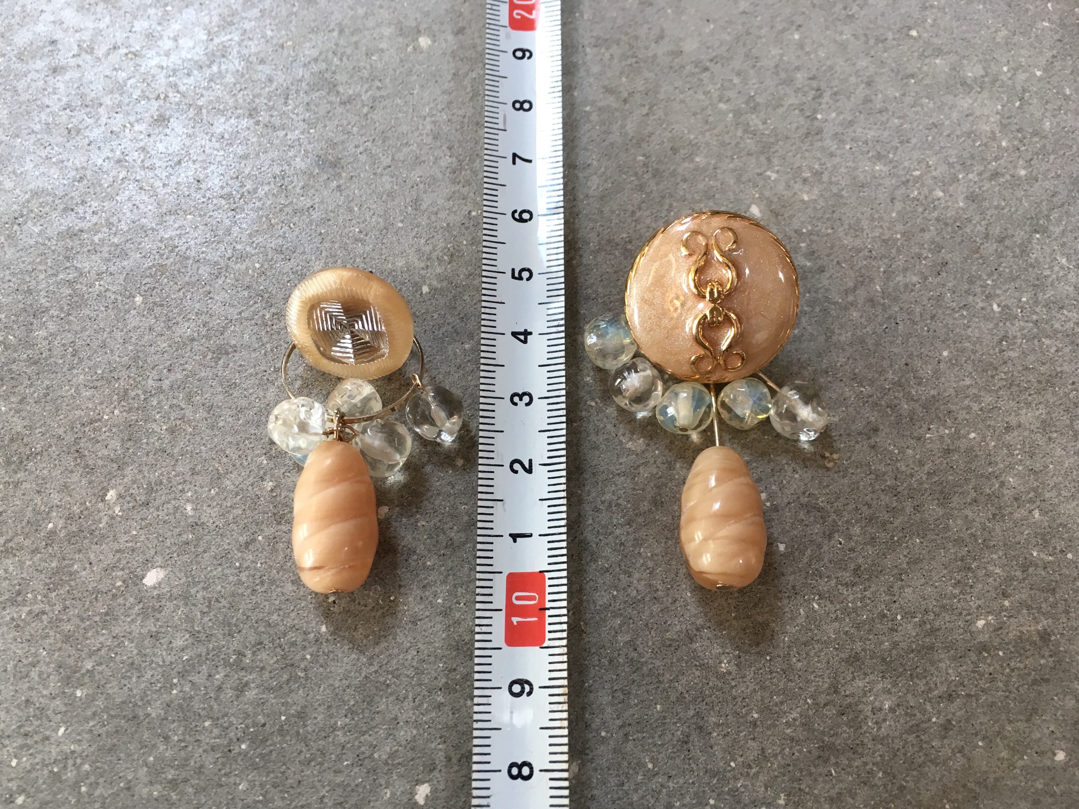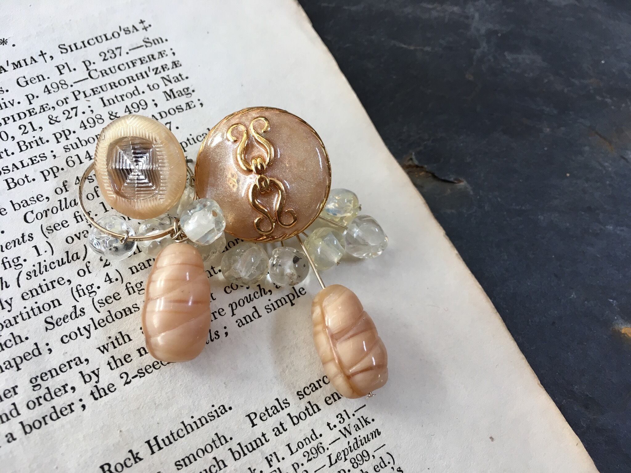 フランスやチェコのヴィンテージ ボタンをカボションに、ヴィンテージ ビーズを散らしてアシンメトリーなピアスに仕上げました。