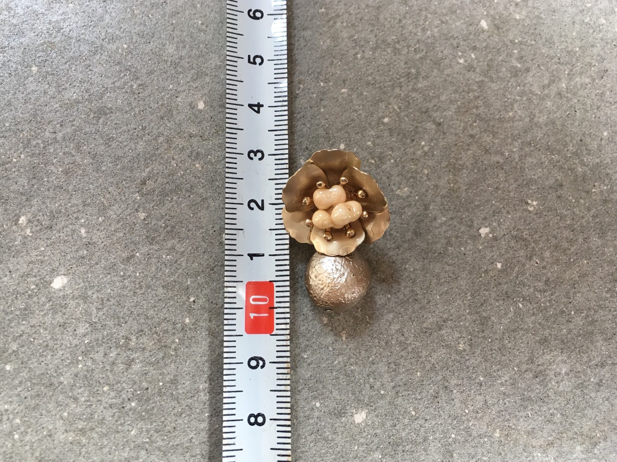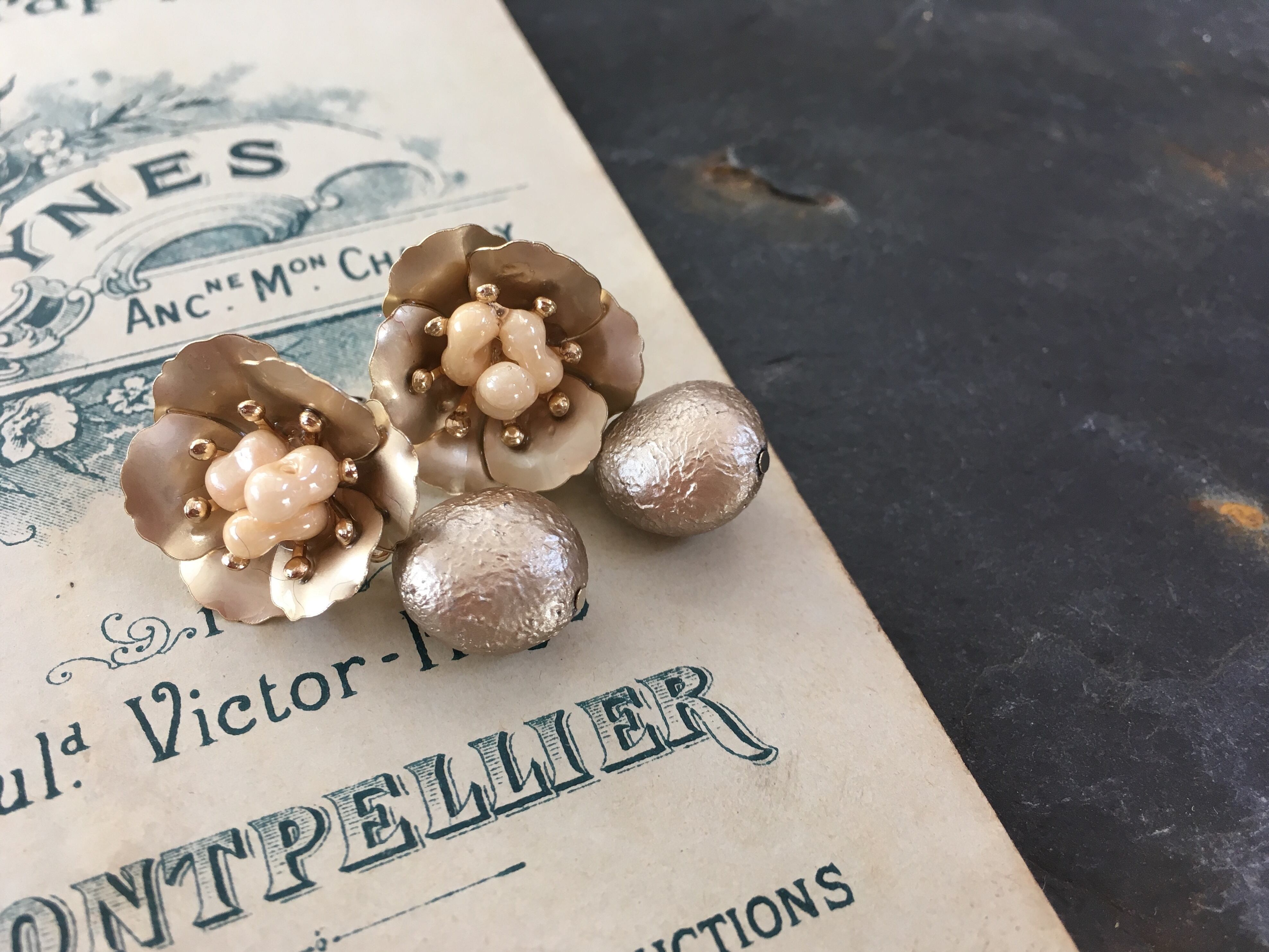 お花パーツにヴィンテージ ビーズを添えてピアスを作りました、