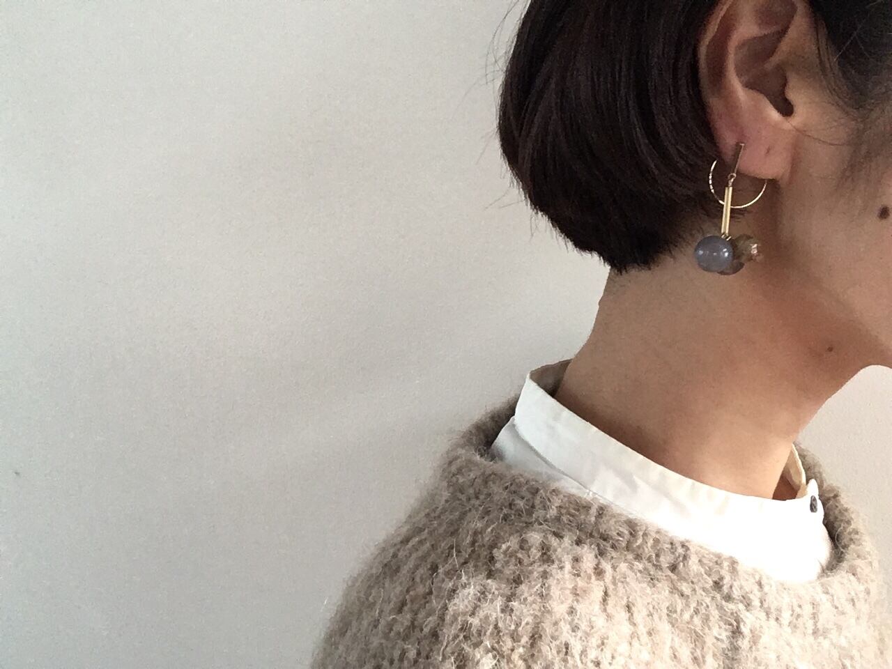 ヴィンテージボタンやヴィンテージビーズ、天然石など、様々な素材を使って、アシンメトリーなピアスに仕上げました。