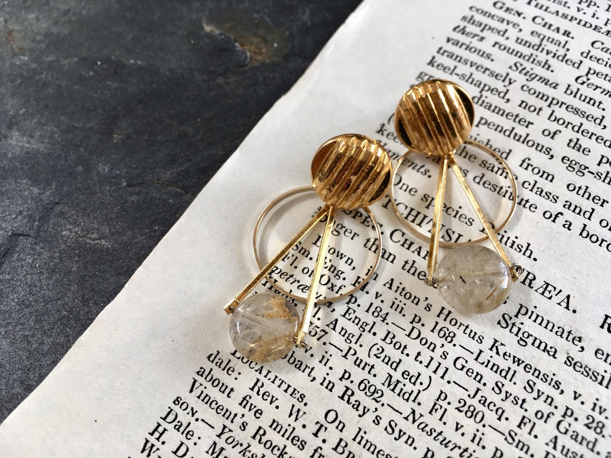 フランスのヴィンテージボタンをカボションに、天然石と金属パーツを組み合わせて、シックなピアスに仕上げました。