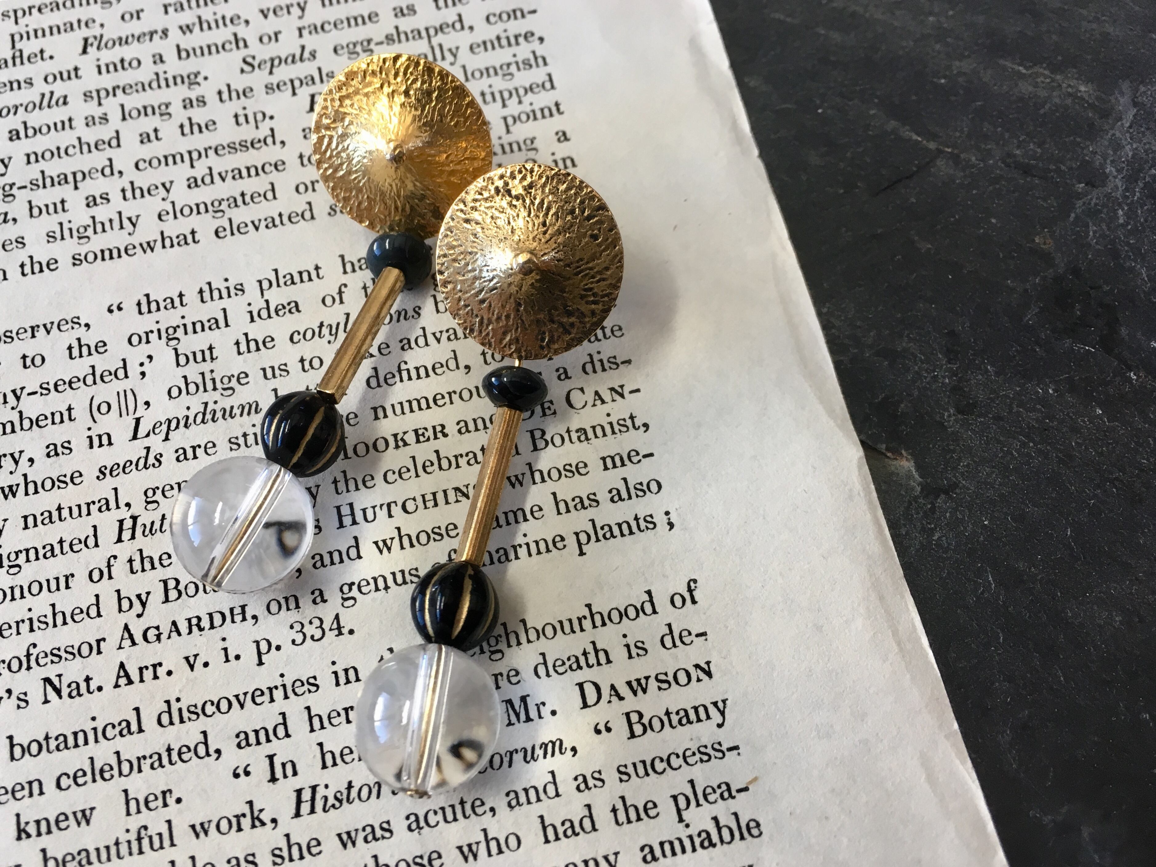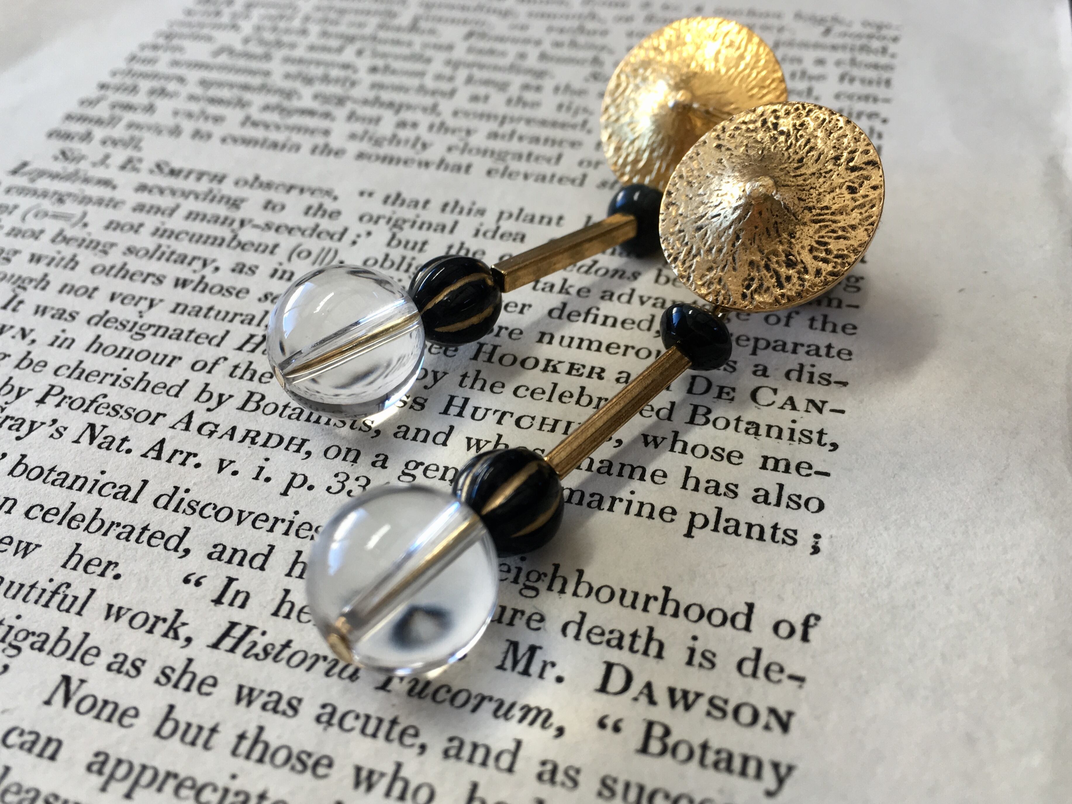 フランスから届いたビンテージボタンに、水晶をバーで繋いでピアスを作りました。