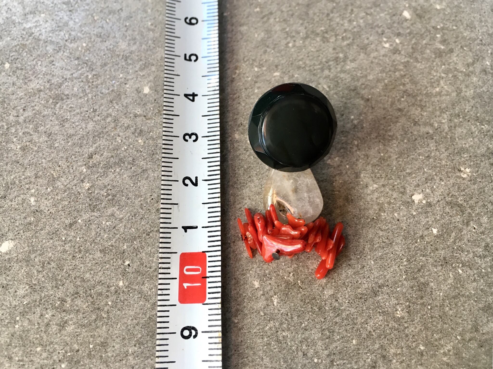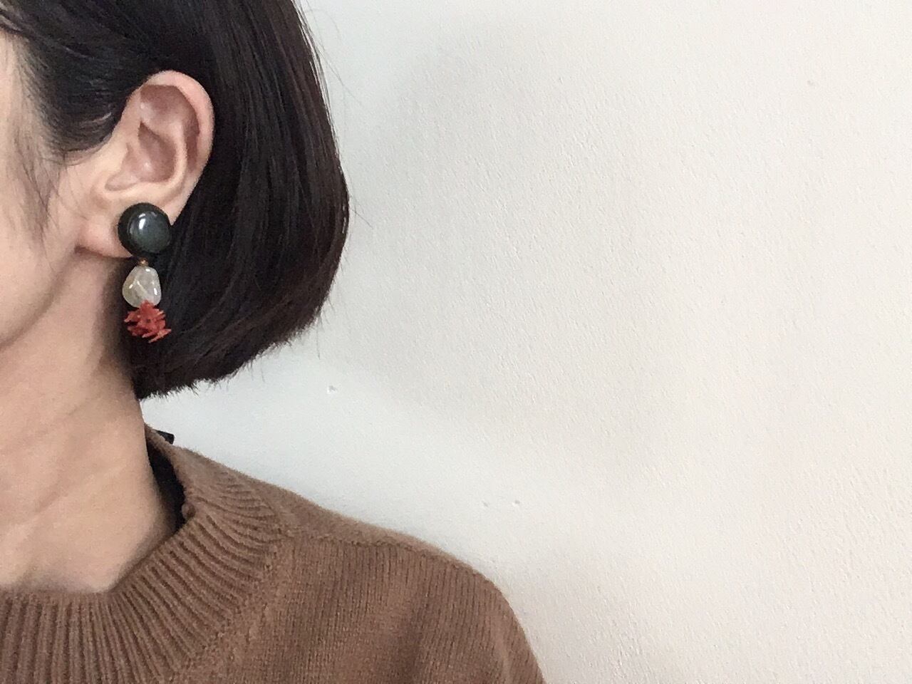 フランスのヴィンテージボタンをカボションに、天然石とサンゴを添えてピアスを作りました。