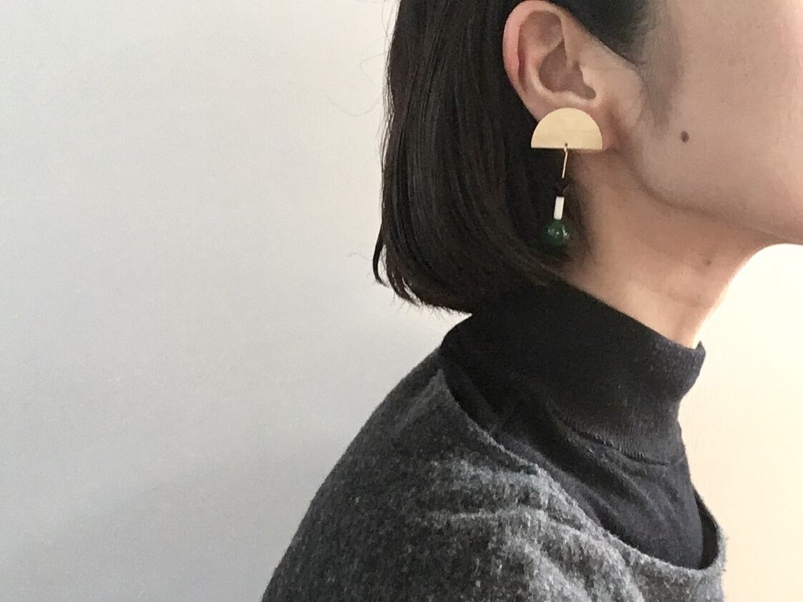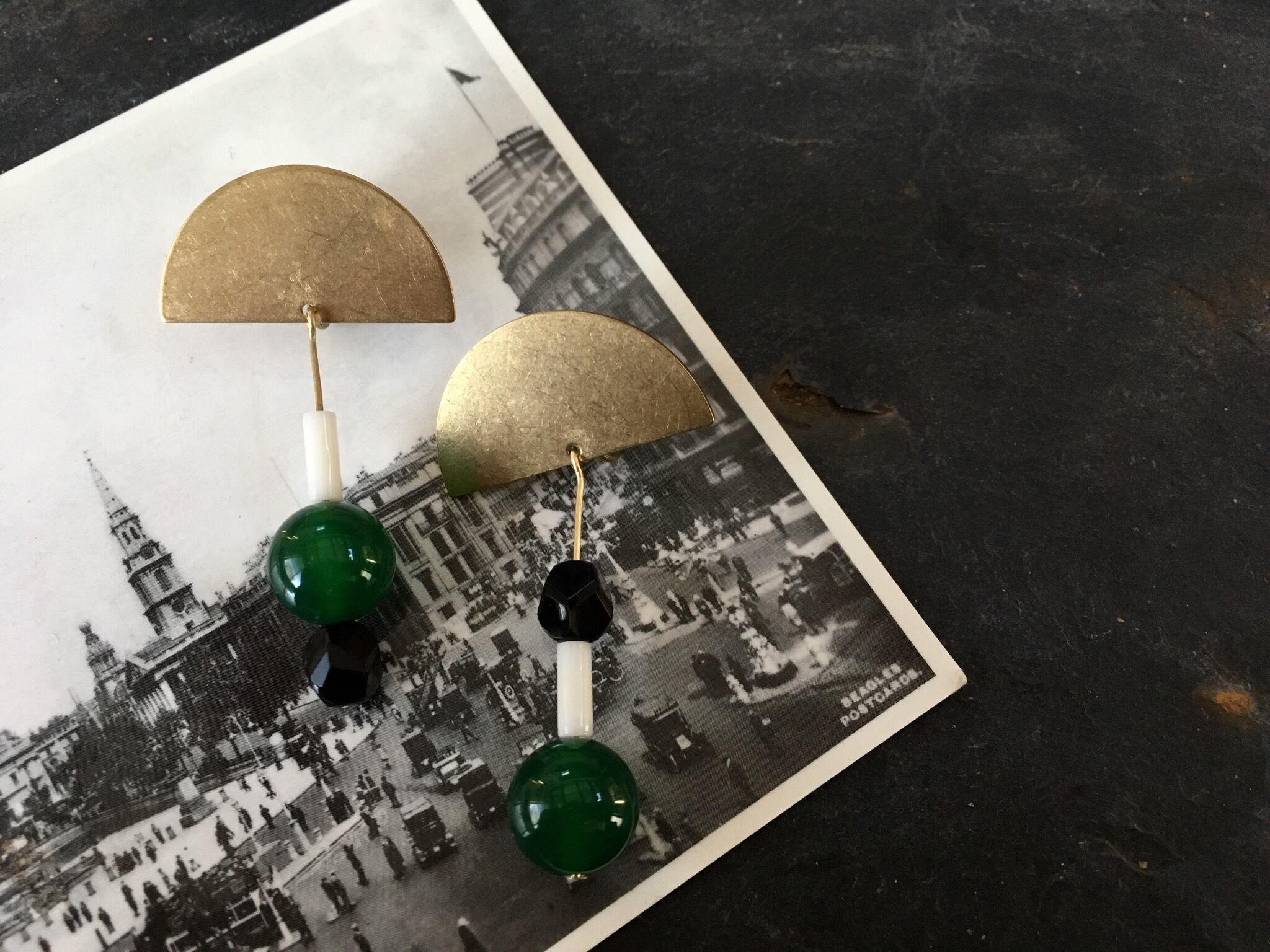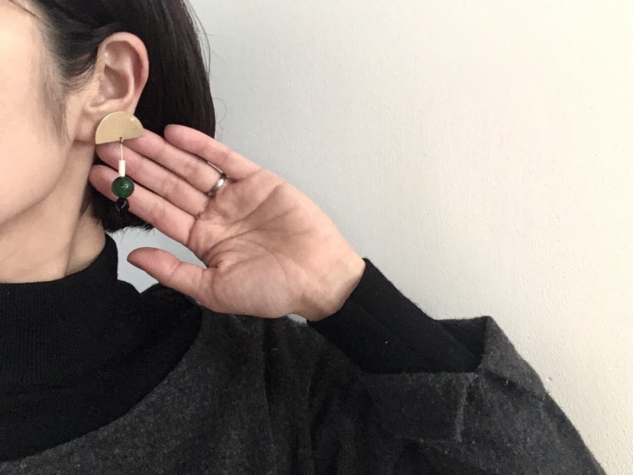 真鍮パーツをカボションに、天然石やヴィンテージビーズを添えて、アシンメトリーなイヤリングに仕上げました。