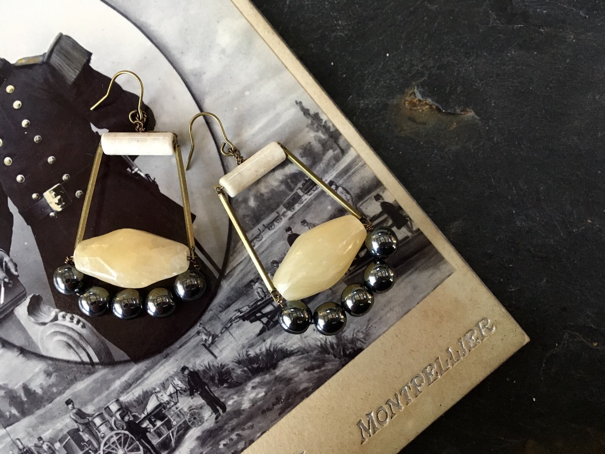 優しくて柔らかな色味を、深いメタリックグレーのガラスビーズが引き締めて、大人っぽいシックな仕上がりになっています。