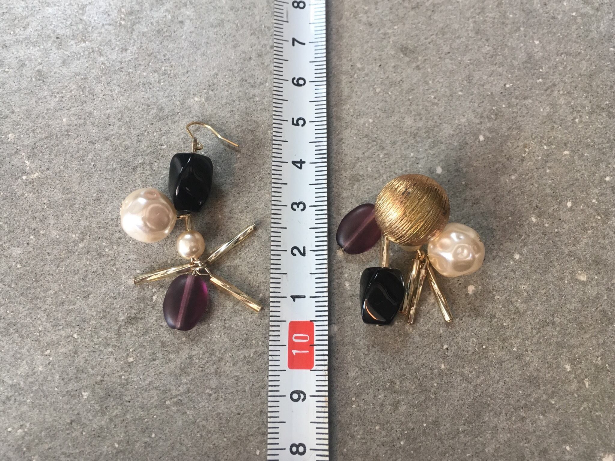 フランスのヴィンテージボタンや、ドイツのヴィンテージビーズなどを組み合わせて、アシンメトリーなピアスに仕上げました。