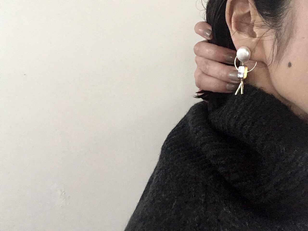 ヴィンテージボタンに天然石やガラスビーズを添えて、アシンメトリーなピアスに仕上げました。