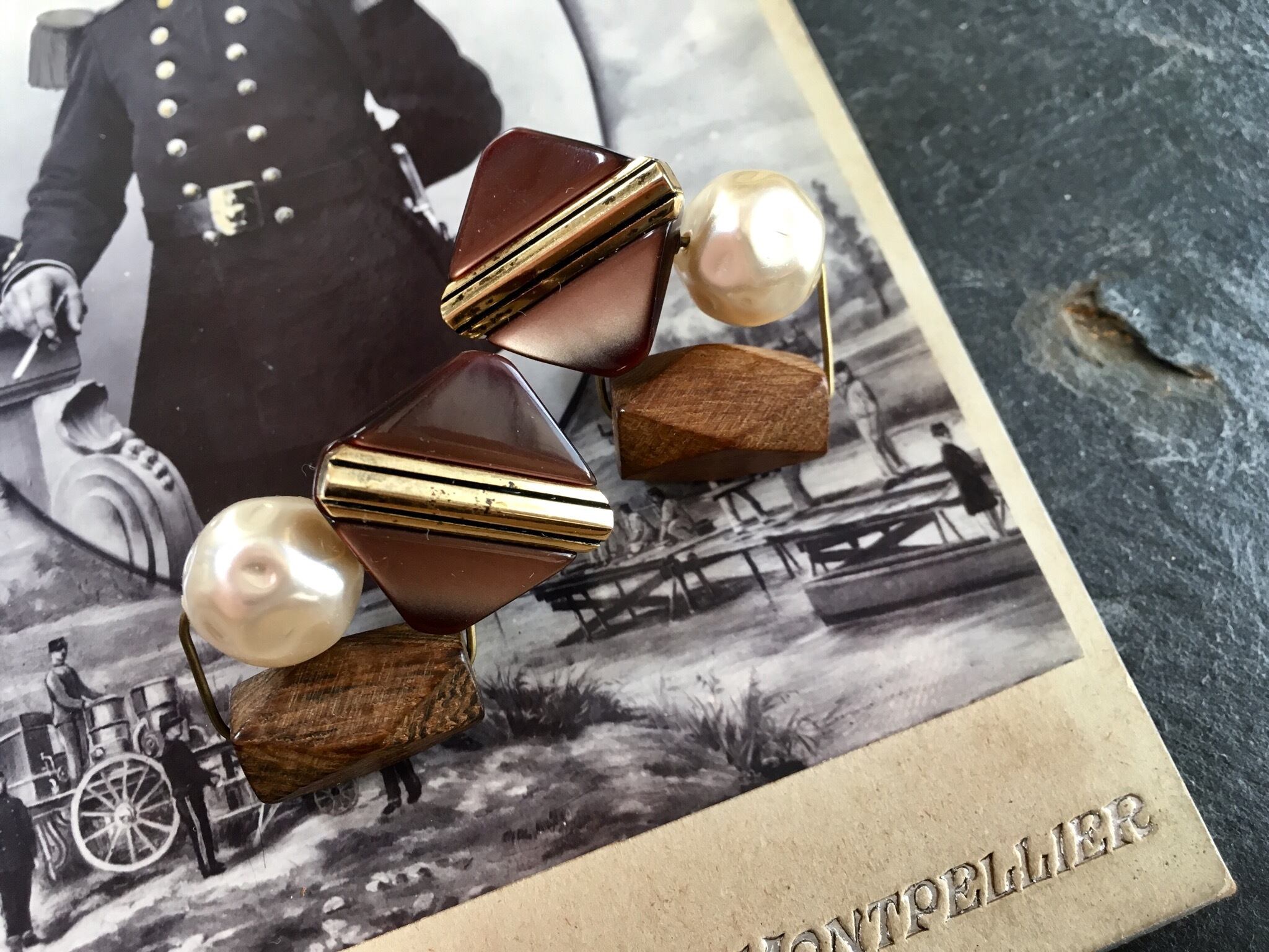 ヴィンテージボタンをカボションに、ウッドビーズとヴィンテージパールビーズを添えてピアスを作りました。