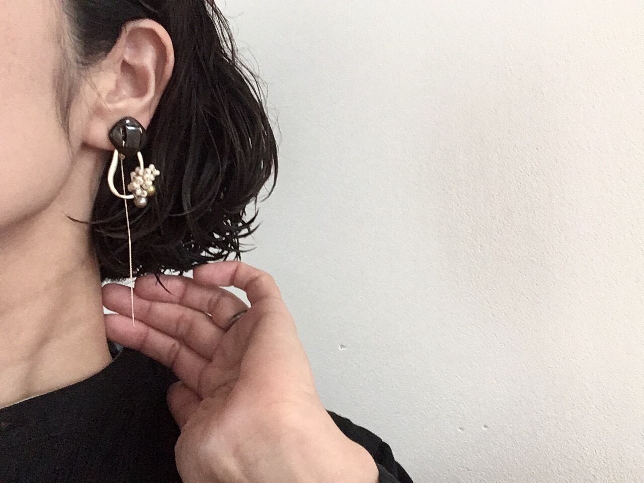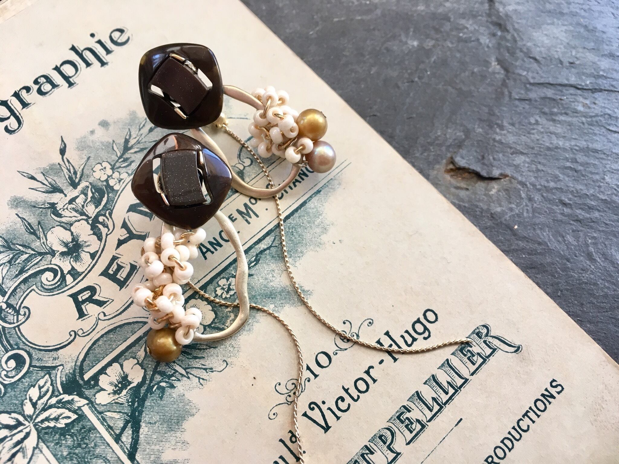ヴィンテージ ボタンにメタルパーツを組み合わせたものに、ボヘミアンビーズやヴィンテージ ビーズを添えてピアスを作りました。