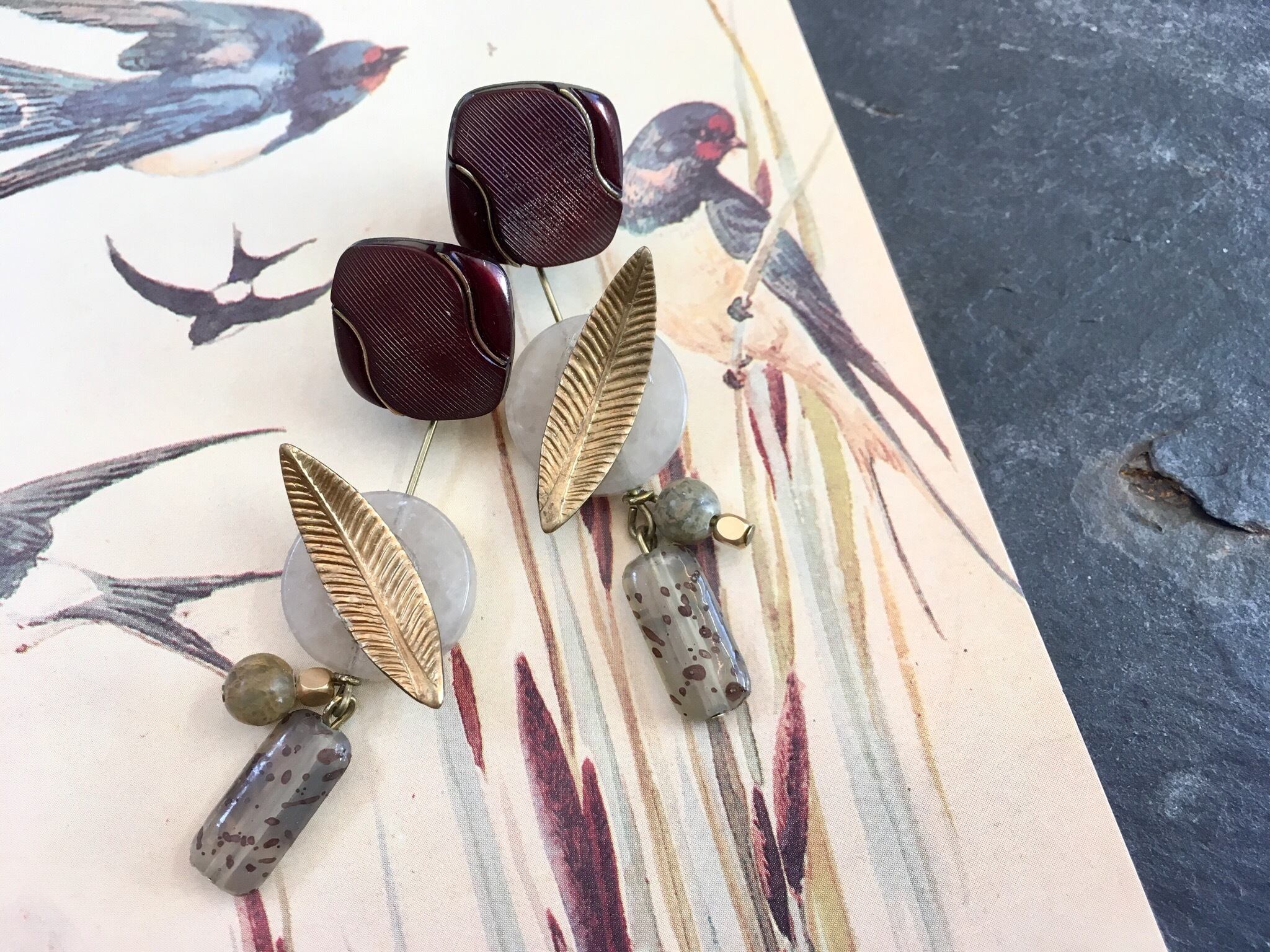 ヴィンテージ ボタンにヴィンテージ パーツやヴィンテージ ビーズ、天然石を合わせて、ピアスを作りました。