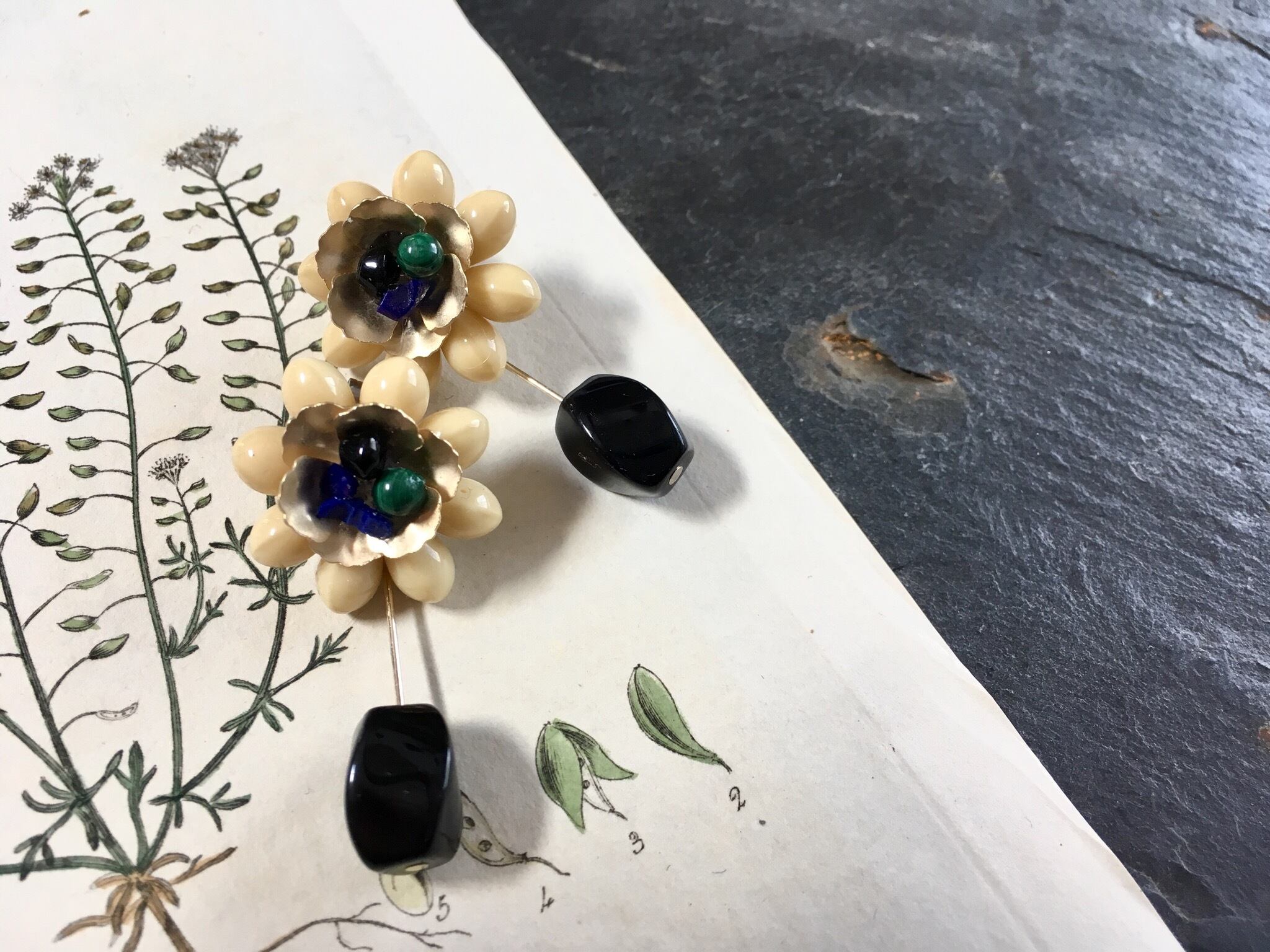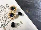 チェコガラスビーズを繋げて花形に整え、ヴィンテージビーズや天然石を合わせたピアスに仕上げました。