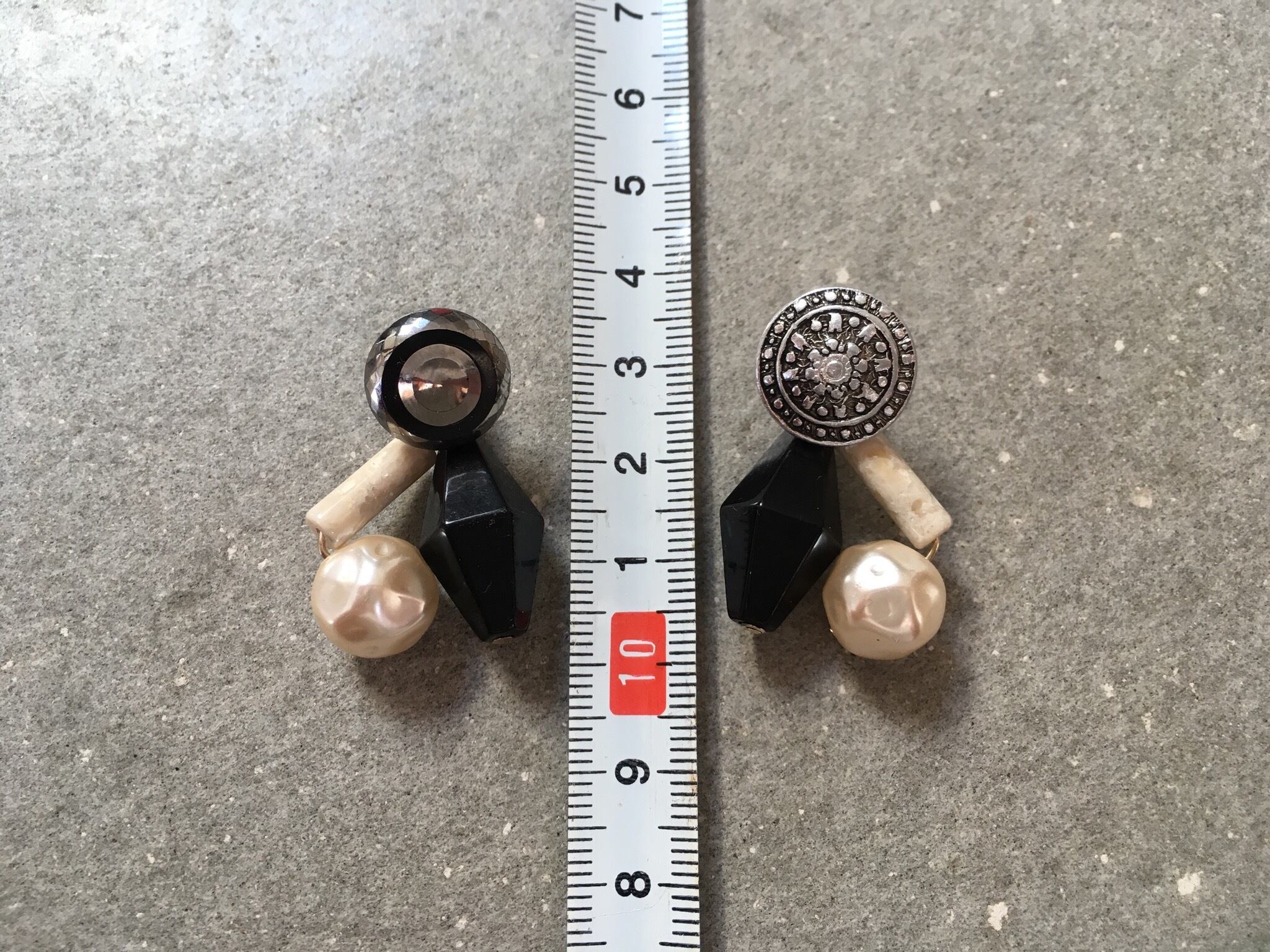 ヴィンテージボタンをカボションに、ヴィンテージ ビーズを添えてアシンメトリーなピアスに仕上げました。