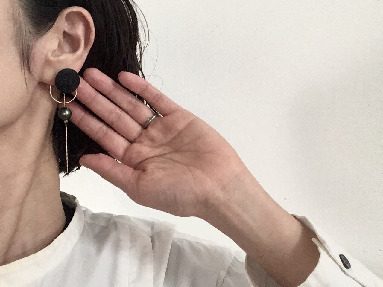 ヴィンテージチェコガラスボタンをカボションに、パールビーズとメタルパーツを組み合わせてアシンメトリーのピアスに仕上げました。