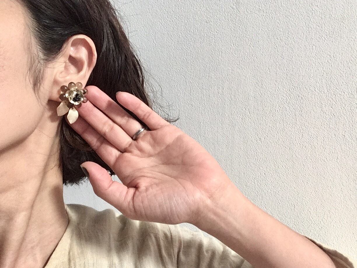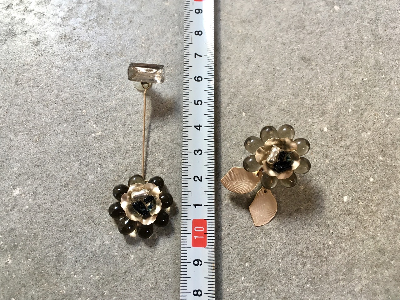 ヴィンテージパーツやメタルパーツ、チェコガラスを組み合わせてアシンメトリーなピアスに仕上げました。