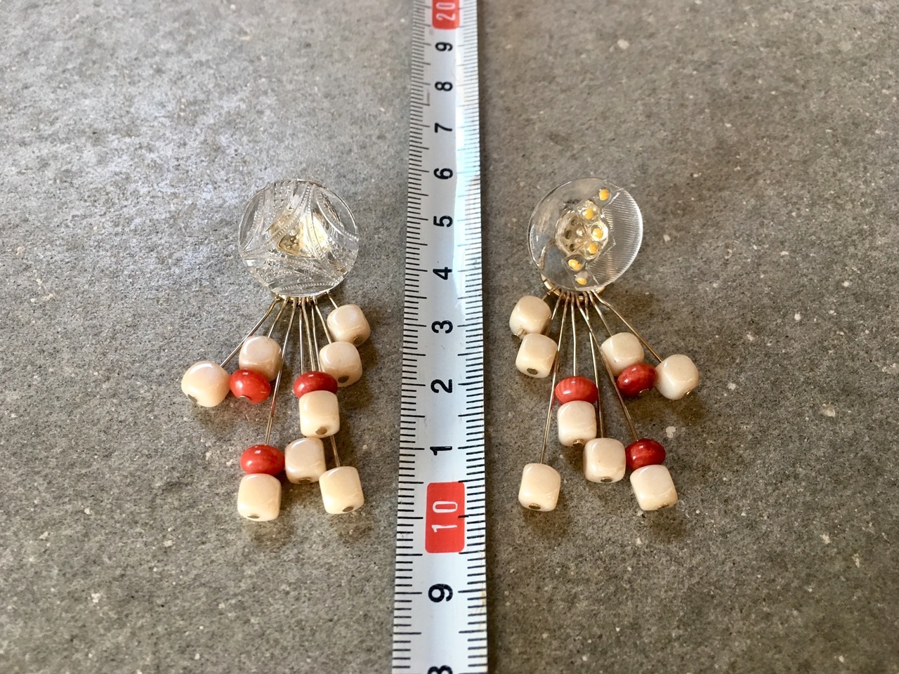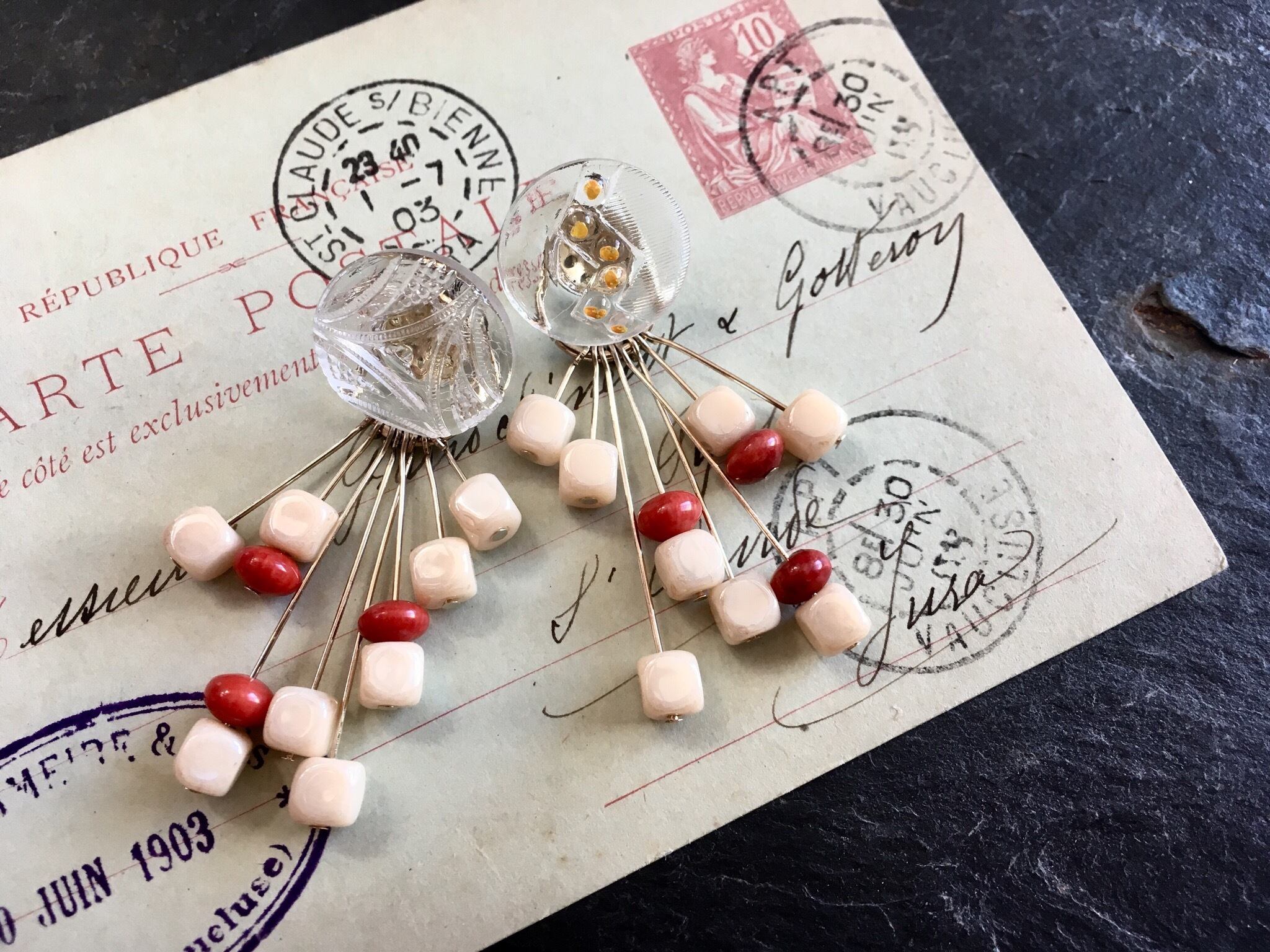 ヴィンテージ  チェコガラスボタンをカボションに、チェコガラスビーズと珊瑚ビーズを添えて、ピアスに仕上げました。