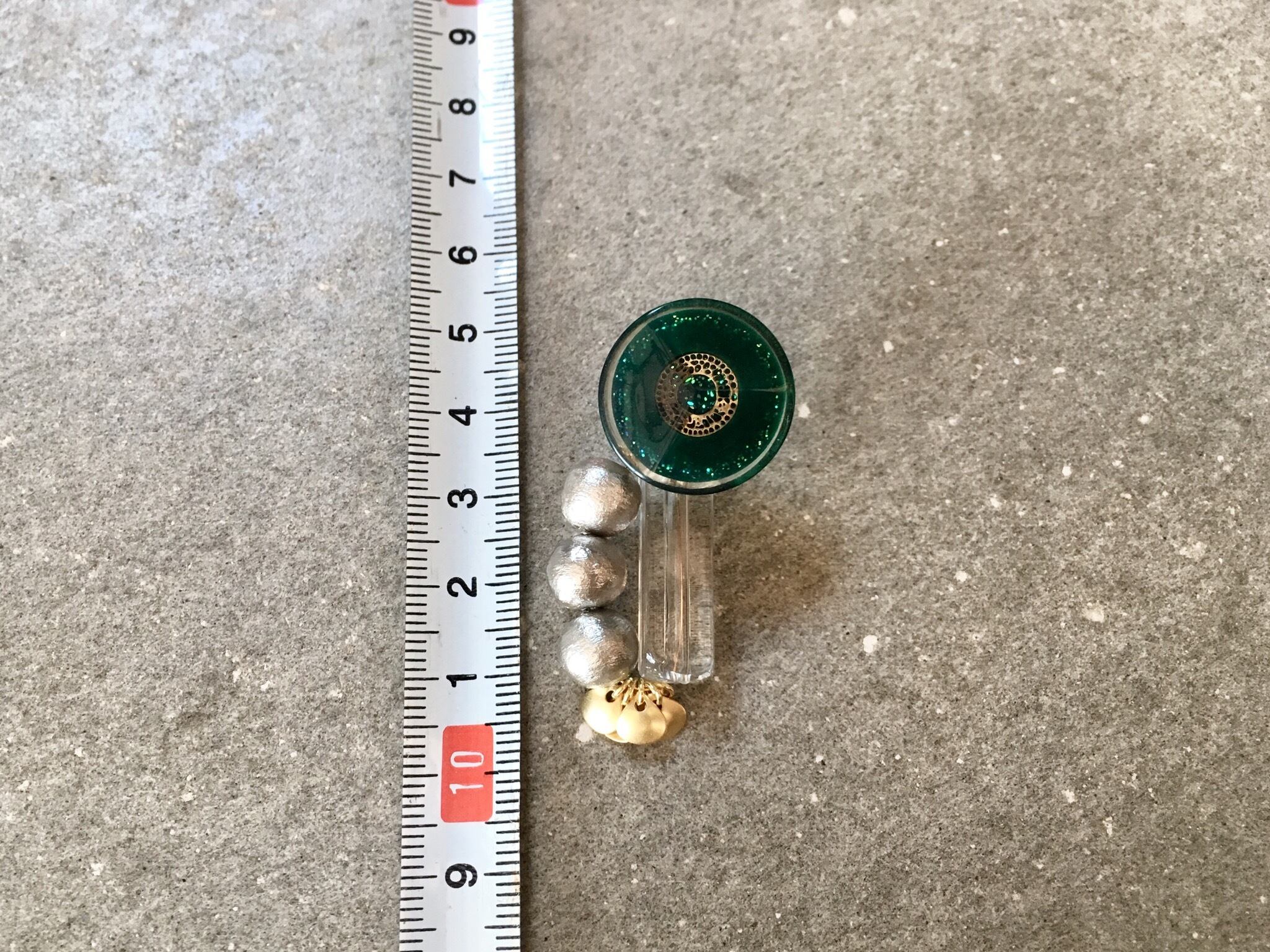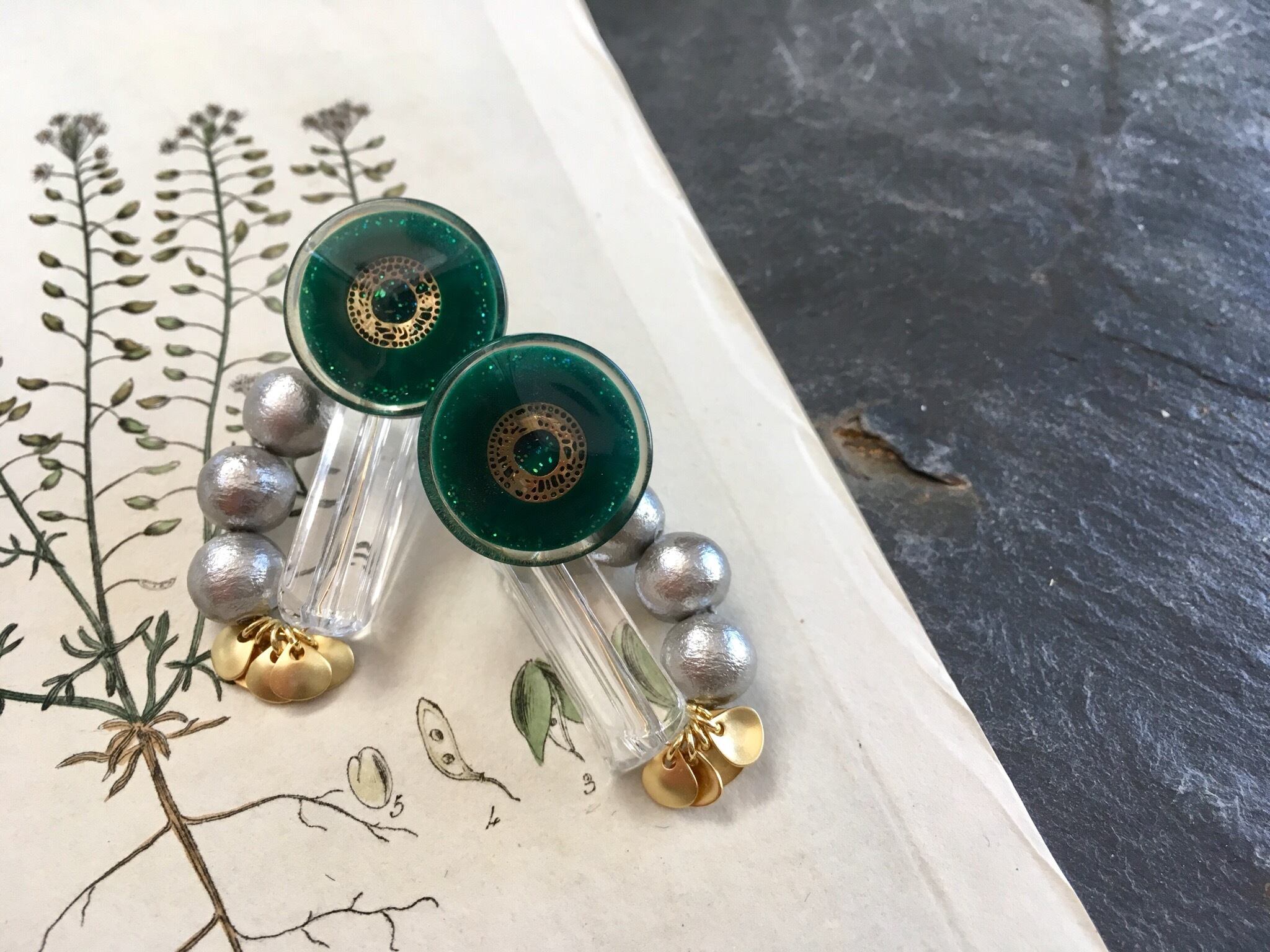 ヴィンテージボタンをカボションに、コットンパールやヴィンテージビーズを添えてピアスに仕上げました。