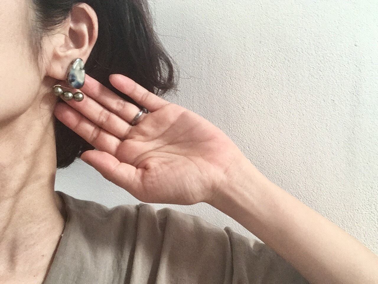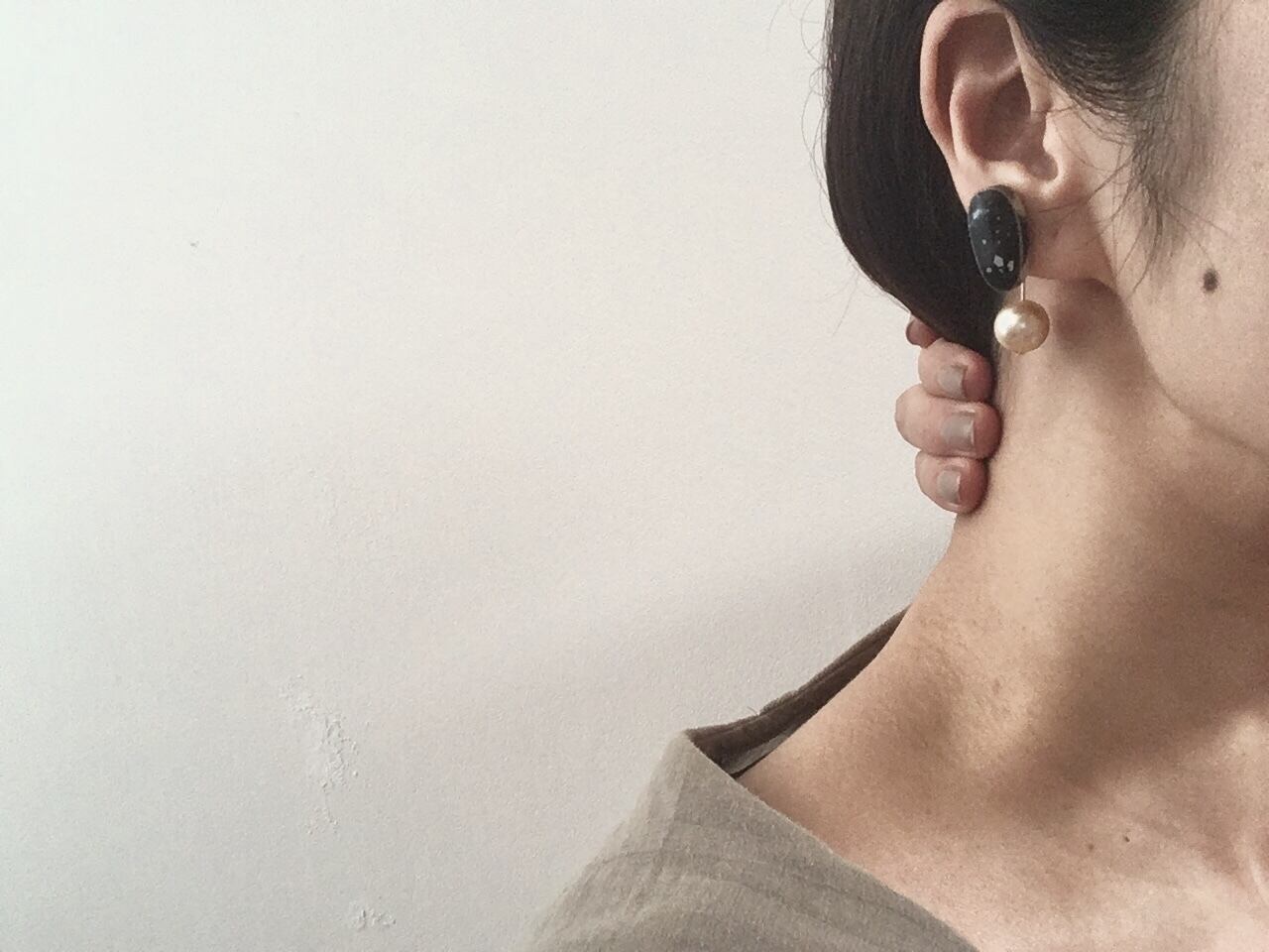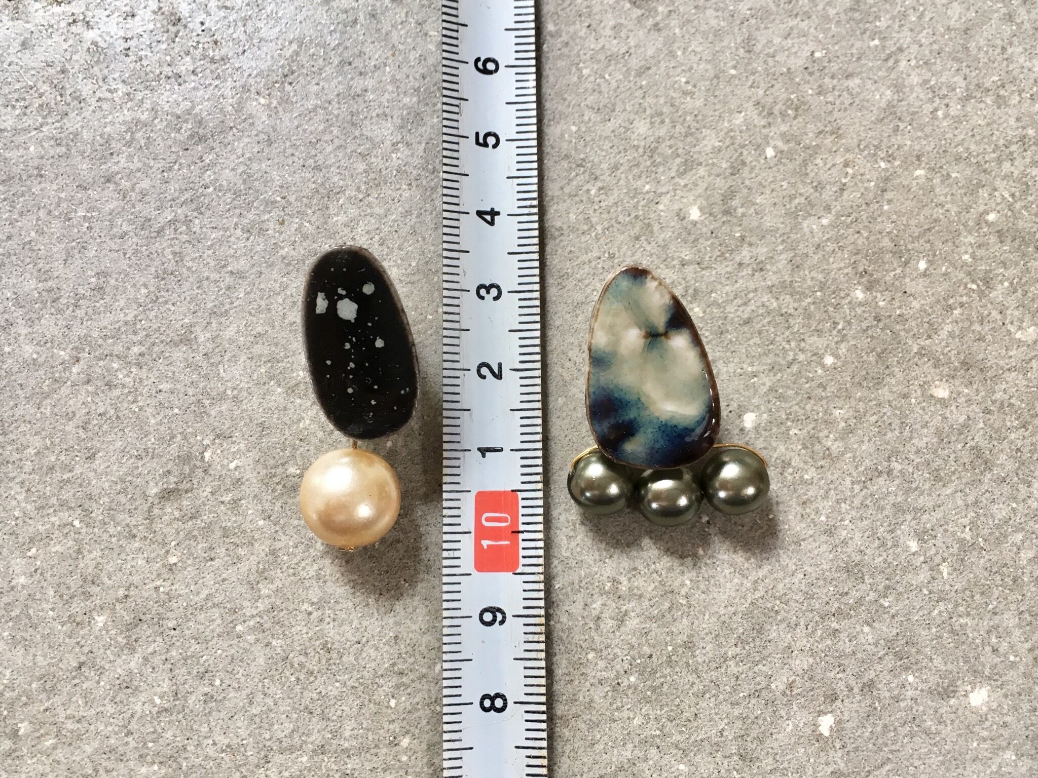 ヴィンテージタイルにヴィンテージパールビーズを添えて、アシンメトリーなピアスを作りました。