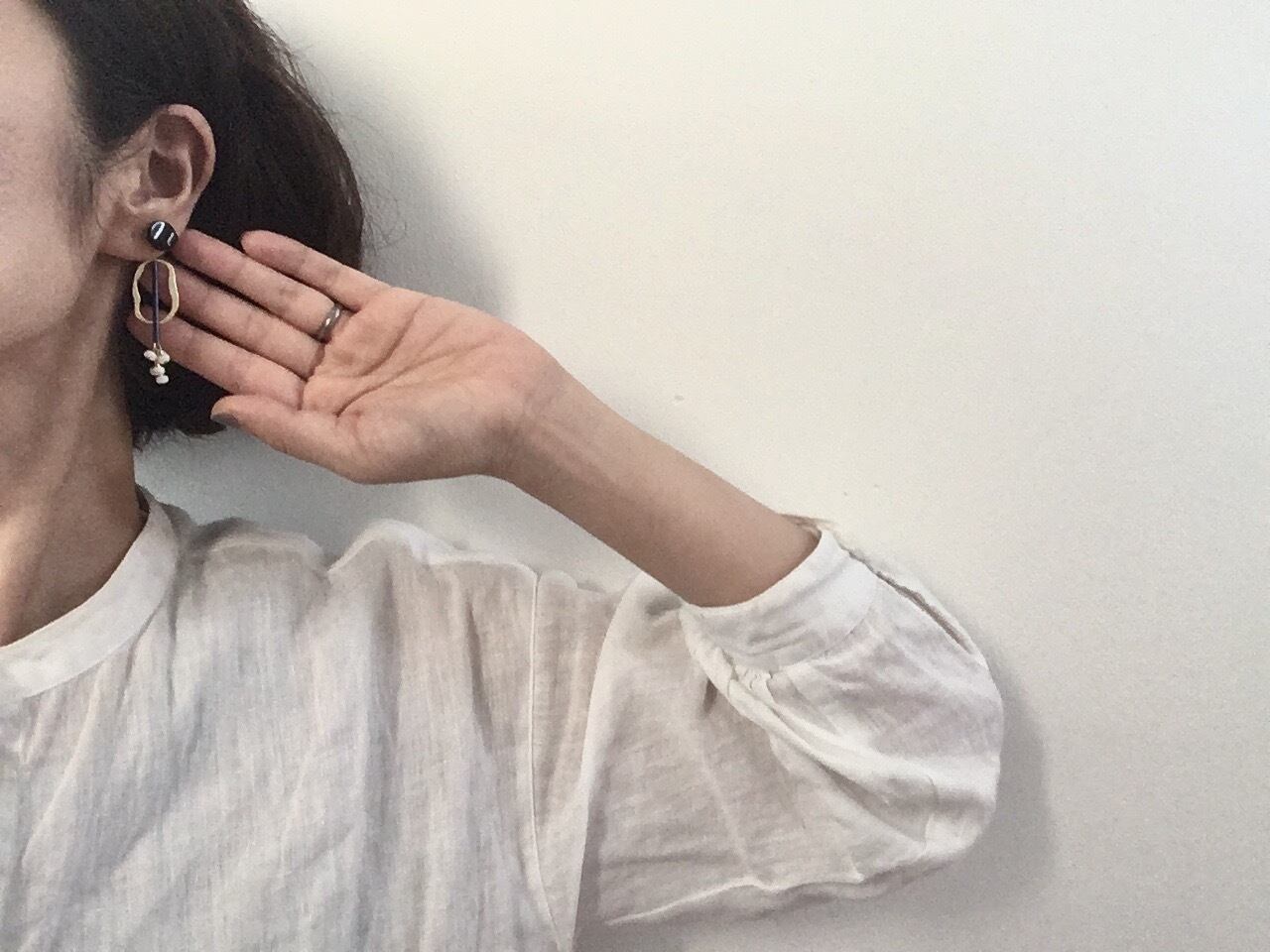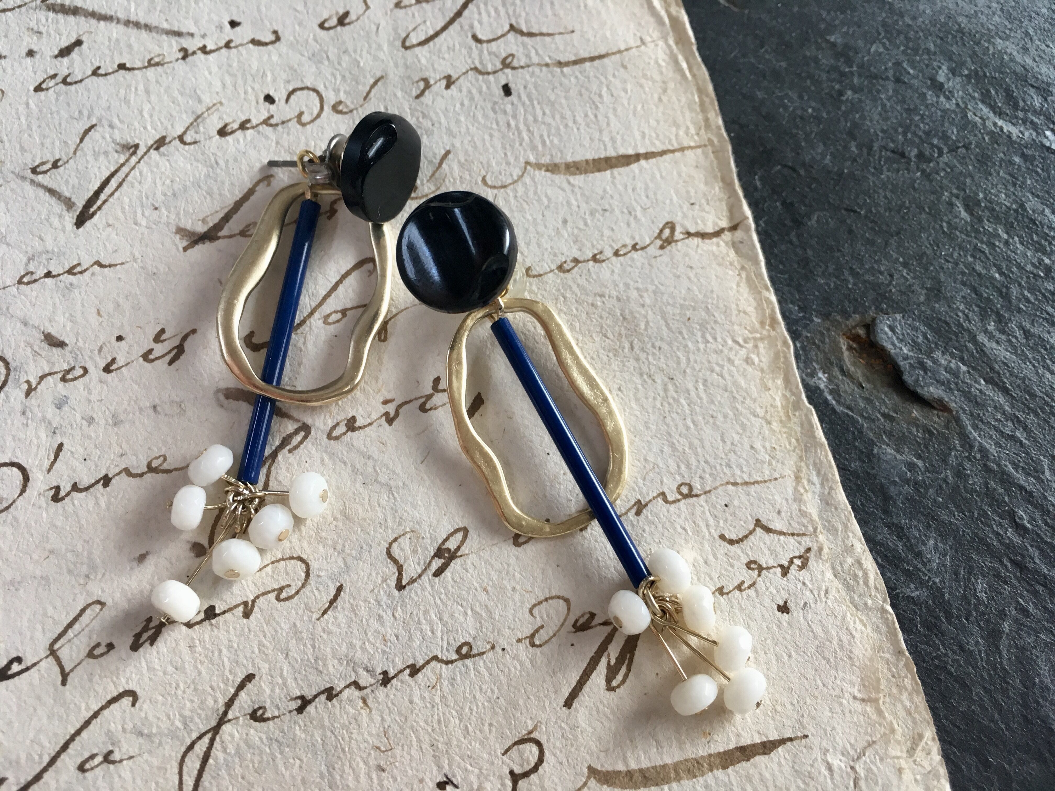 フランスのヴィンテージボタンに、メタルパーツと白サンゴのビーズを組み合わせて、ピアスに仕上げました。