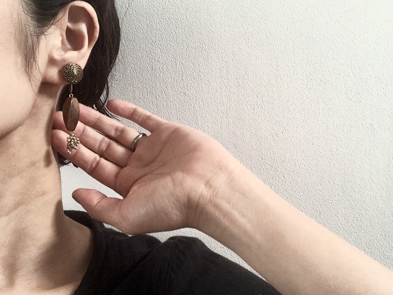 ヴィンテージボタンをカボションに、ウッドビーズとシードビーズを添えてピアスに仕上げました。