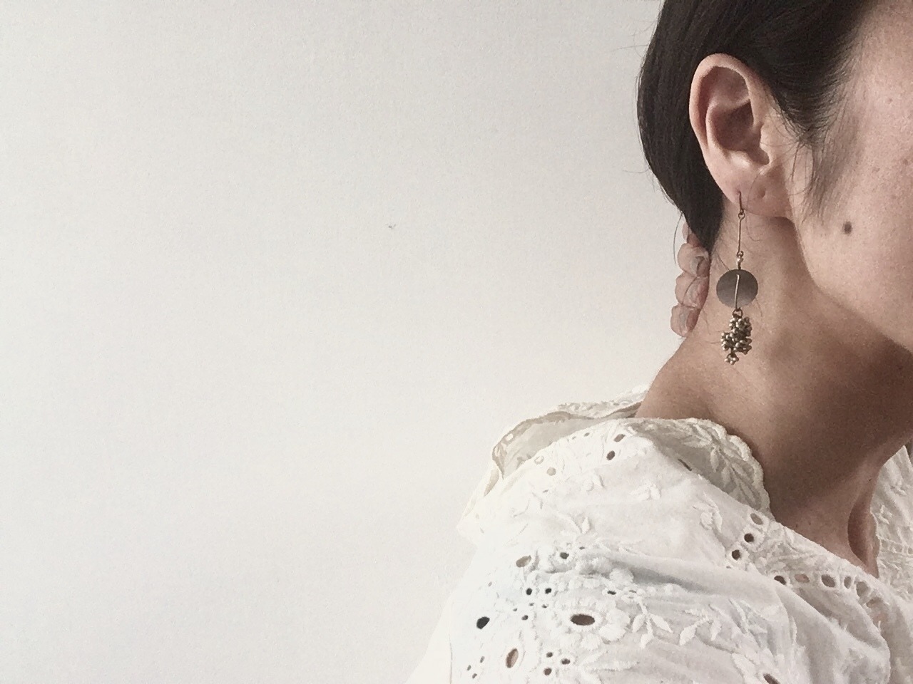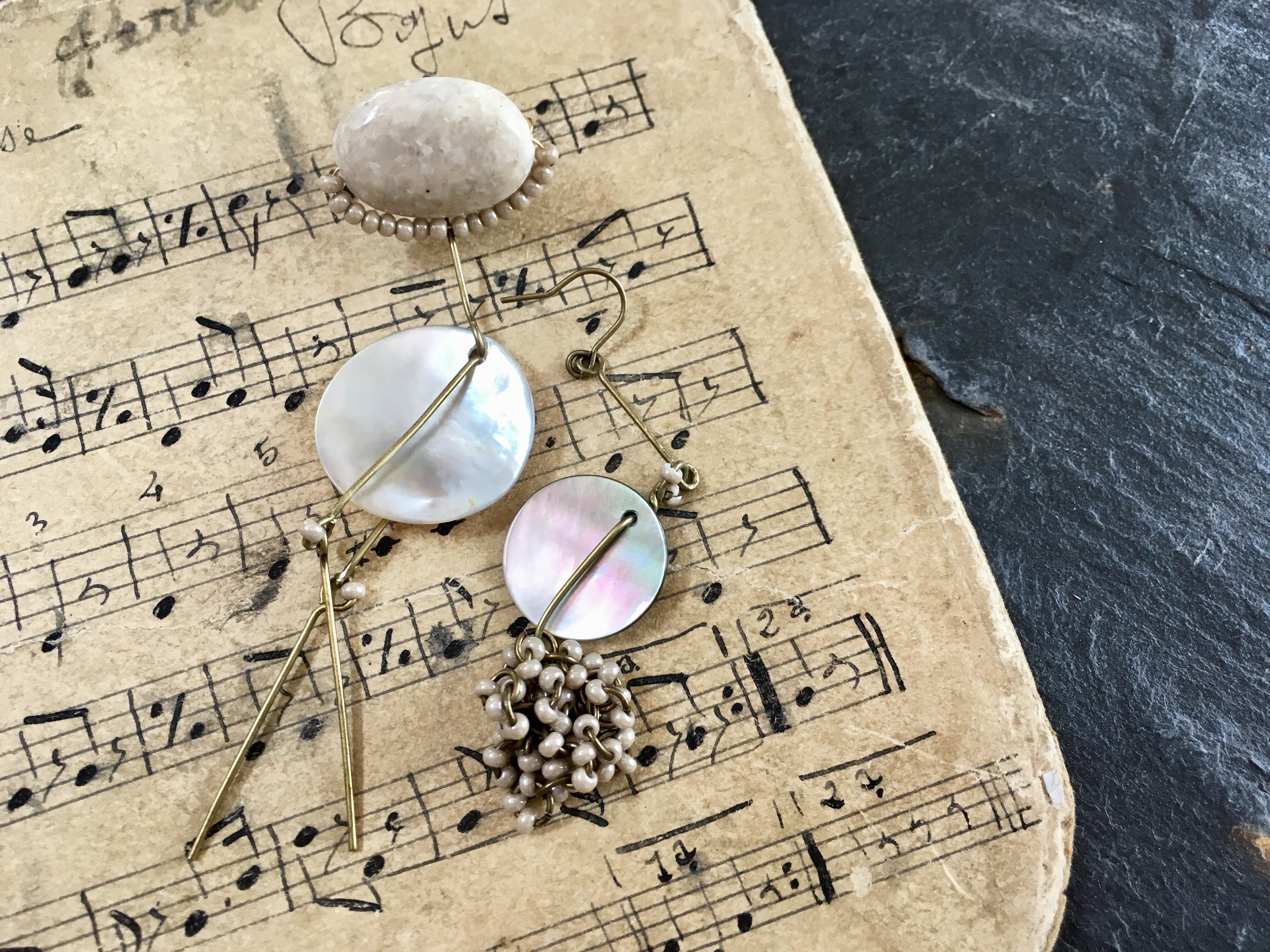 天然石やシェルビーズ、シードビーズを使って、アシンメトリーなピアスに仕上げました。