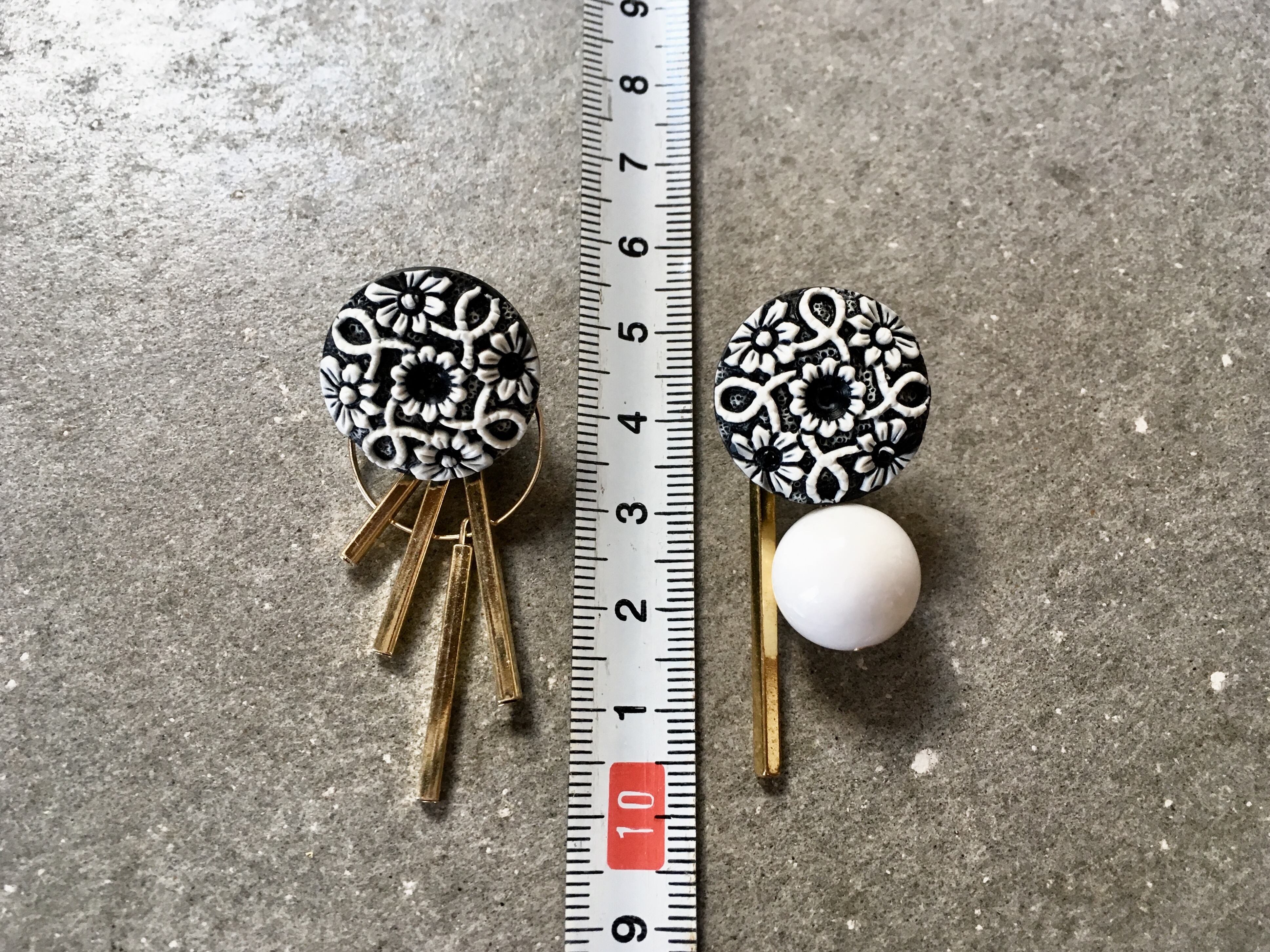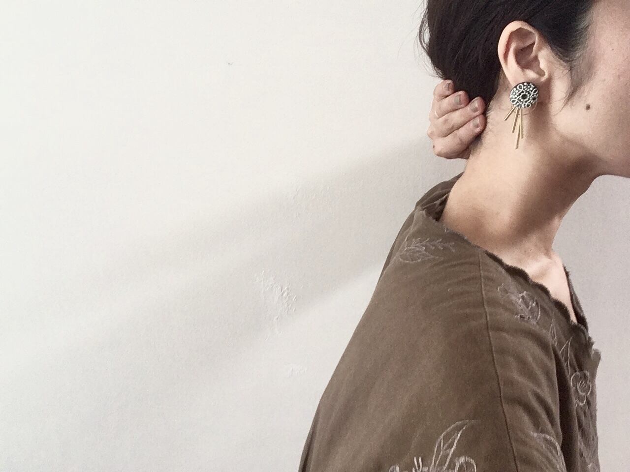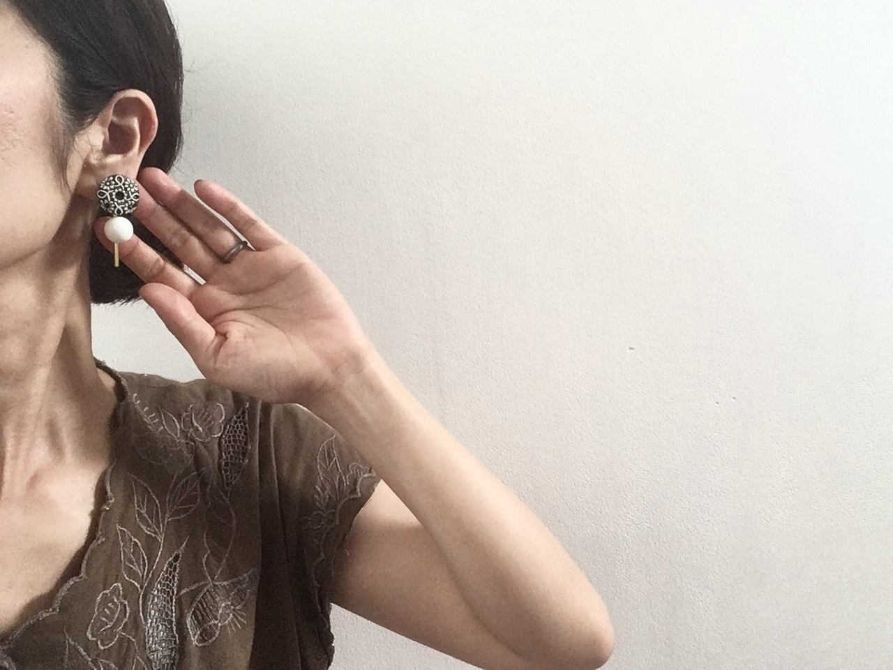 ヴィンテージボタンにメタルパーツとヴィンテージビーズを組み合わせて、アシンメトリーなピアスに仕上げました。