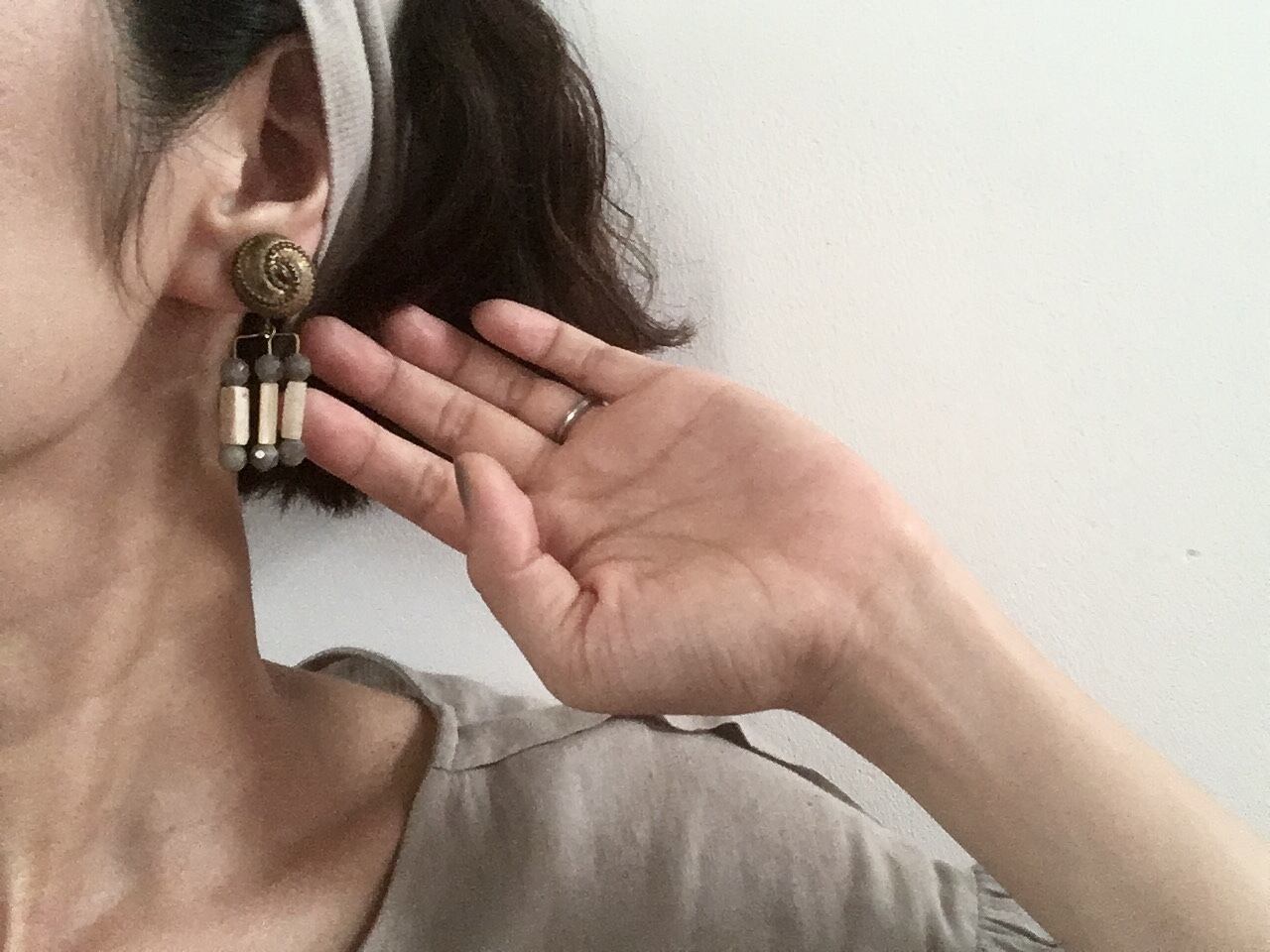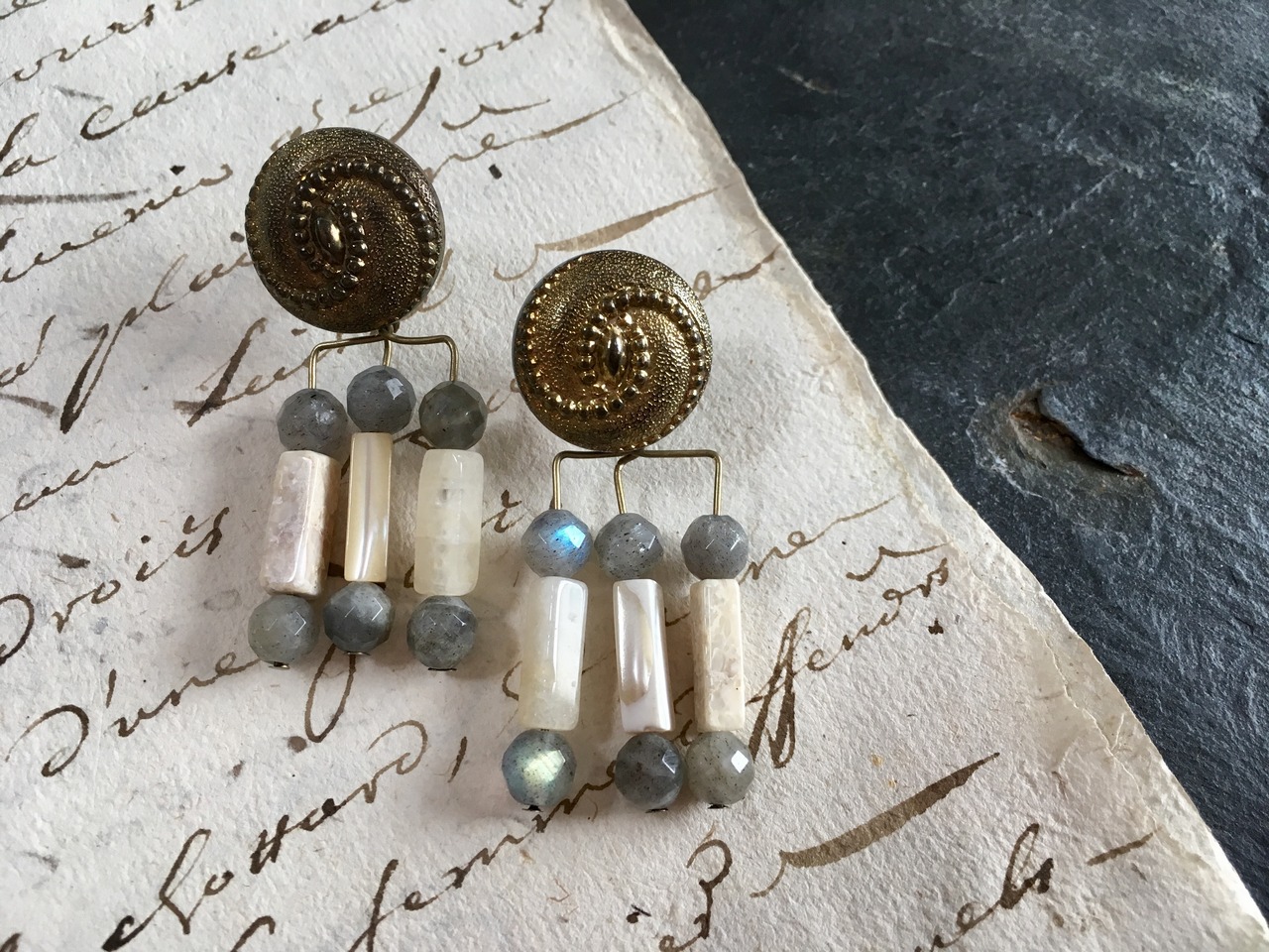 ヴィンテージボタンをカボションに、それぞれ異なる素材の天然石やシェルを添えて、ピアスに仕上げました。